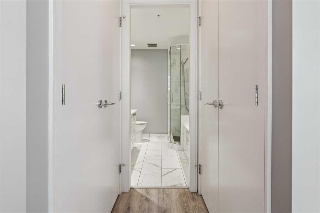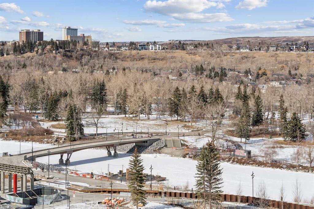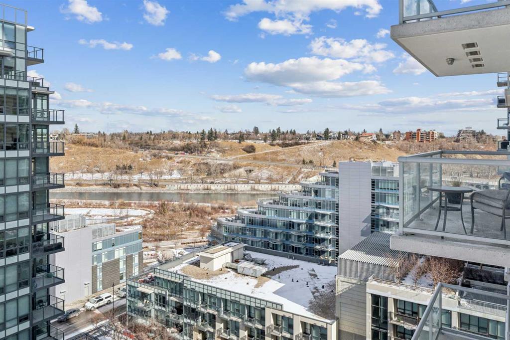 Sky-High Luxury Living in the Waterfront! Prime northwest corner location with spectacular views of Prince's Island Park, Bow River, mountains, COP and the downtown city lights! The many large expansive corner windows provide an abundance of bright natural light while enhancing those incredible views from every room! Exceptional open floor plan that's perfect for entertaining and great layout with opposite side bedrooms for complete privacy! Completely renovated kitchen, bathrooms, flooring and UV-Coated windows all in 2018. Immaculate 2 Bedroom + Den home with gorgeous hardwood flooring, quartz counter-tops throughout, soft-close kitchen drawers, custom Hunter Douglas blinds and tasteful recessed lighting! You'll be sure to enjoy the large covered balcony with incredible views, natural-gas fireplace, 5 pce ensuite bath with soaker tub and rain shower, custom closet organizers, separate office-den, open kitchen with large eat-in Island, gas range, 2 built-in freezer drawers, brand new dishwasher and microwave, separate laundry room with storage, high-end stack washer/dryer and spacious entrance to greet your guests. Comes with 2 very convenient SXS parking stalls across from elevator doors and storage locker in secure storage room. The luxurious Waterfront towers provide first-class amenities with concierge service, impressive lobby with comfortable seating area, fully equipped fitness center, hot tub area, steam room, yoga studio, social lounge with billiard table, awesome Theater room, private inner courtyard and car wash facilities! The location is extraordinary along the south bank of the Bow River next to Prince's Island Park, world-class pathway system, near by shops and boutiques, great restaurants and cafes, Chinese Cultural Center and quick access to transportation and the LRT. Time to enjoy the ultimate in downtown urban living!