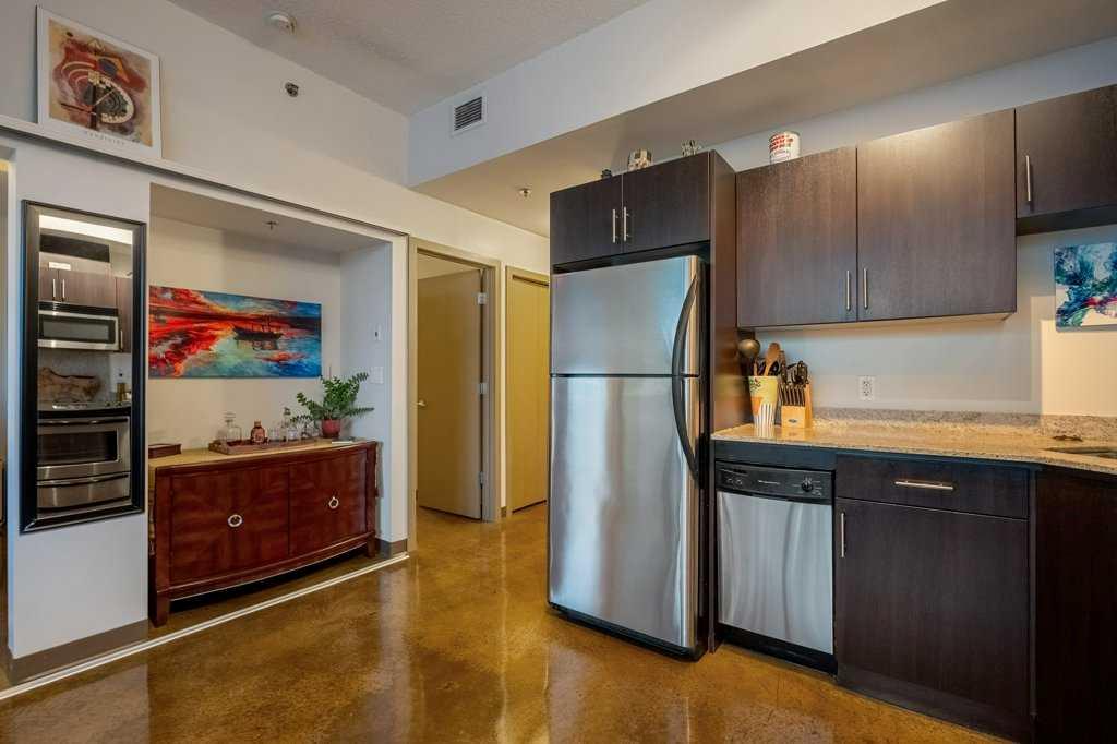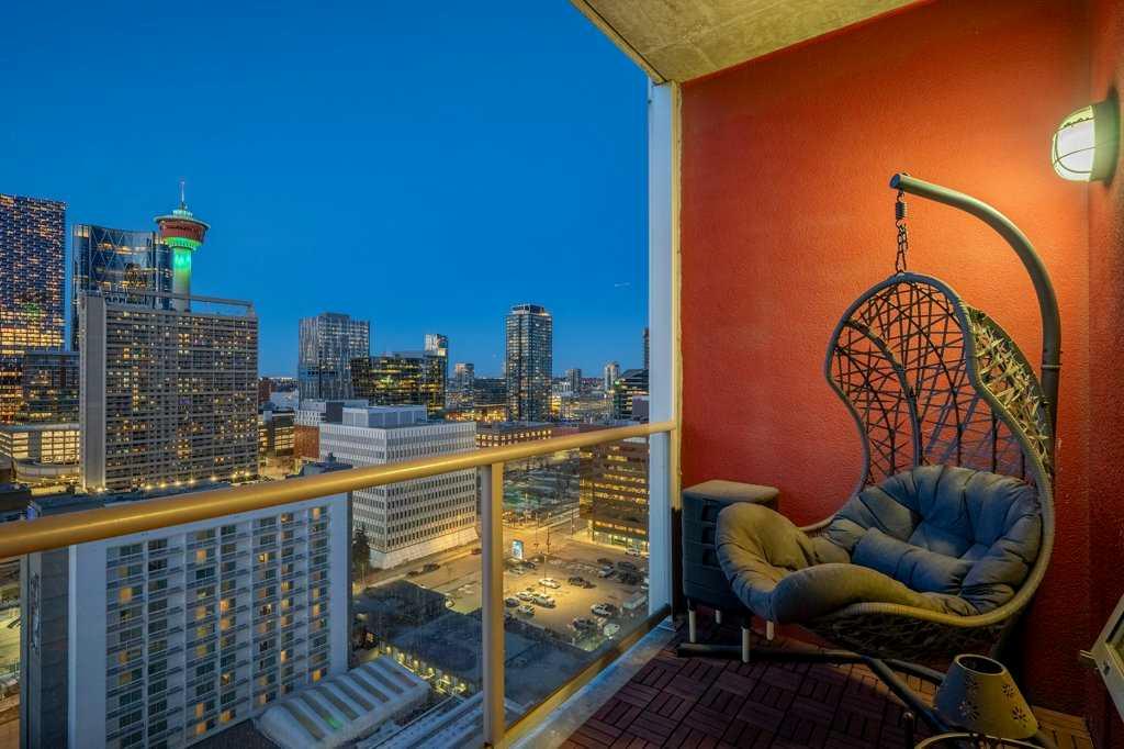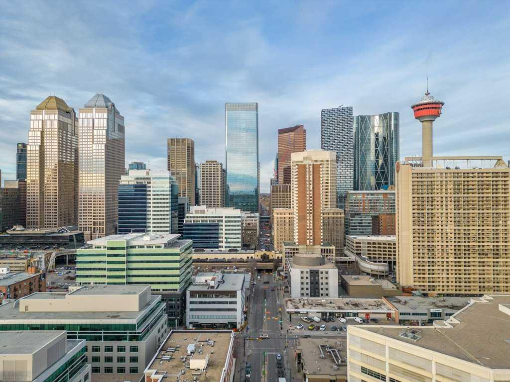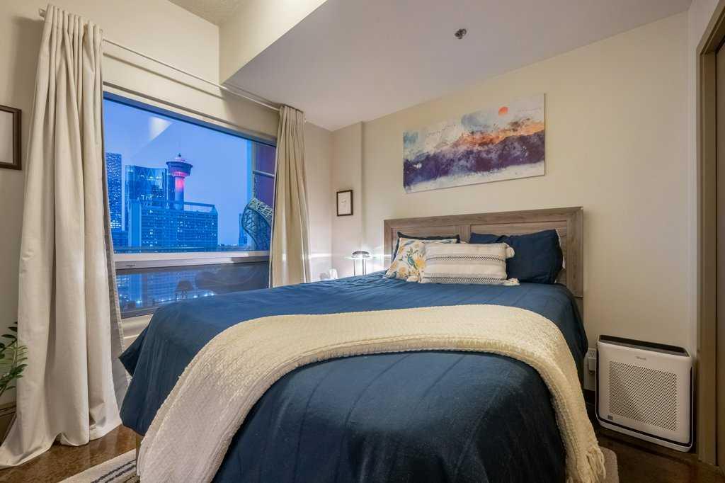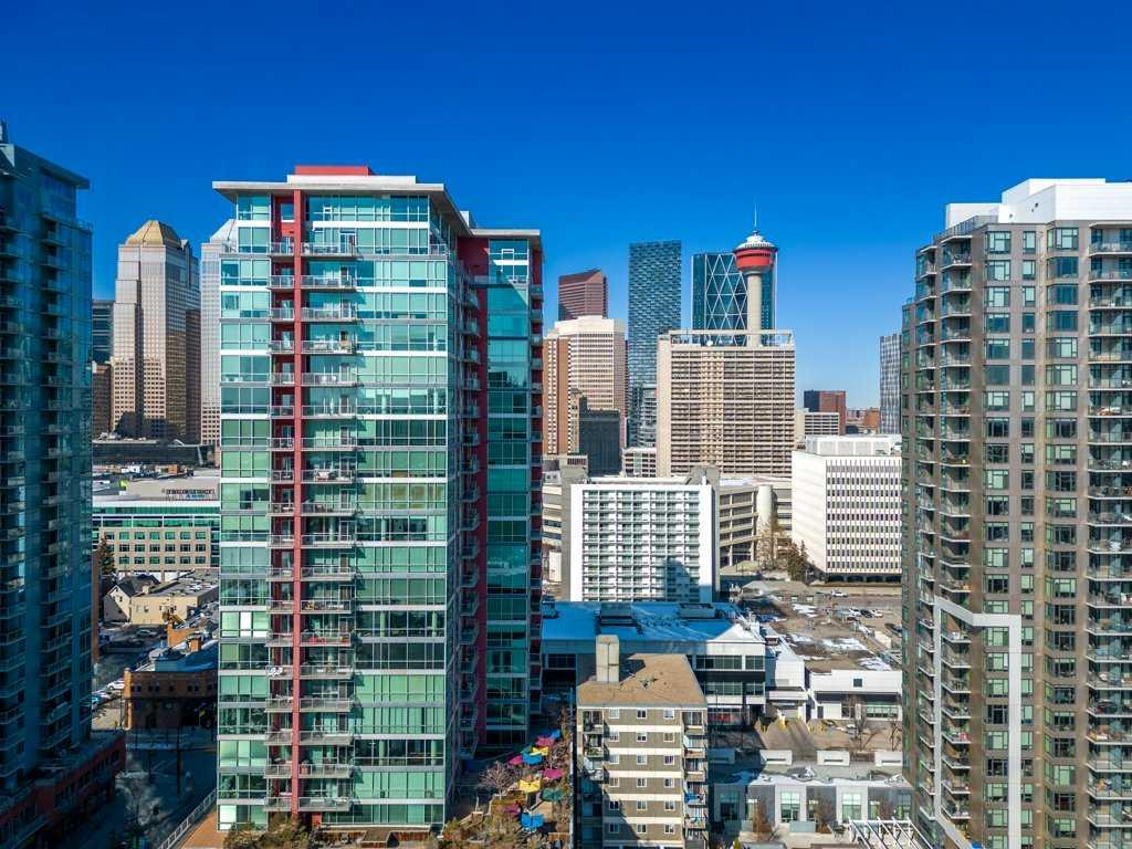 Seventeen floors above the city, the perspective changes. The noise fades, the skyline sharpens and Calgary stretches out before you like a living postcard. This is Colours, a short-term rental approved complex, where a coveted two bedroom residence delivers a truly panoramic view of the downtown skyline. You know, the kind of million dollar outlook typically reserved for penthouses - yet here you experience it for roughly a third of the price. Stunning floor-to-ceiling north facing windows frame the city like artwork, flooding the space with natural light while showcasing Calgary’s towers, lights and endless urban energy. The freshly polished concrete floors add warmth and modern edge, perfectly complementing the open-concept layout that flows effortlessly between the kitchen, dining and living spaces. The primary bedroom becomes a front-row seat to the skyline, offering a calm retreat with those same sweeping visuals, while the versatile second bedroom easily transforms into a guest room or home office. Step onto your private balcony with natural gas hookup and watch the city shift from golden sunset to sparkling evening lights - a daily reminder that some views never get old. Boasting central A/C, underground parking stall, bike storage and a shared outdoor community garden that brings colour and greenery to the area. And the lifestyle below? It's just as compelling: order top shelf cocktails at Proof, grab a quick bite at First Street Market, Ten Foot Henry, Pat & Betty, St James Corner or Calcutta Cricket Club. Calgary's emerging entertainment district is just moments away which include the new arena, shopping destinations and convention centre. You are also completely walkable to the c-train line, Central Memorial Park, 17th Avenue, downtown office core and the Stampede grounds. Whether you’re a young professional, first-time buyer, investor or someone simply looking to live above it all, Colours ticks all the boxes. The skyline everyone wants - the price few expect.