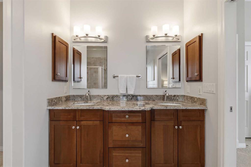 Executive WALKOUT BUNGALOW on a private OVERSIZED LOT in a park-like setting. Located in Elgin Estates BACKING ONTO WALKING PATHS with serene POND VIEWS. This beautifully maintained home features 10’ CEILINGS, CUSTOM 8’ DOORS & TRIM, with built-in CEILING SPEAKERS throughout. The MAIN FLOOR includes a stunning OFFICE with glass French doors, a spacious living room anchored by a GAS FIREPLACE with LARGE WINDOWS overlooking the backyard. The bright dining area with PATIO DOORS and transom window leads to the full width deck to enjoy outdoor dining. The upscale kitchen offers warm wood cabinetry, GRANITE countertops, UNDERMOUNT LIGHTING, abundant drawers, a built-in WINE RACK, and corner pantry—perfect for entertaining. The primary suite captures stunning backyard and pond views through floor-to-ceiling windows and includes a luxurious 5-PC ENSUITE with dual sinks, soaker tub, and WALK-IN CLOSET with CUSTOM BUILT-INS. The MAIN FLOOR LAUNDRY is complete with additional cabinets and storage with a sink for optimal convenience. The fully finished WALKOUT BASEMENT with IN-FLOOR HEATING provides a large family room for entertaining with a second GAS FIREPLACE. The SECONDARY OFFICE SPACE is host to built-in cabinetry, with two generous bedrooms, and a 4-pc bath perfect for the growing family or guests. A HOBBY ROOM WITH SINK (ideal for wine making) connects to a separate COLD ROOM, while the LARGE WORKSHOP features 240V power, its own ELECTRICAL PANEL, custom made workbench with loads of storage and the ability to be vented outside, creating endless opportunities for a future kitchen or home gym. Additional highlights include TRIPLE-PANE windows, central A/C, underground SPRINKLERS with Bluetooth control, GEMSTONE EXTERIOR LIGHTING, Dura-deck with glass railing, and a covered lower patio. The professionally designed and thoughtfully landscaped private backyard with WATER FEATURE completes the PARK-LIKE SETTING. Completing the home is an OVERSIZED double attached GARAGE with built-in WORKBENCH, drawers and shelving. A rare opportunity to own a meticulously maintained executive bungalow with PREMIUM FEATURES, exceptional outdoor space and convenient access to Stoney Trail.