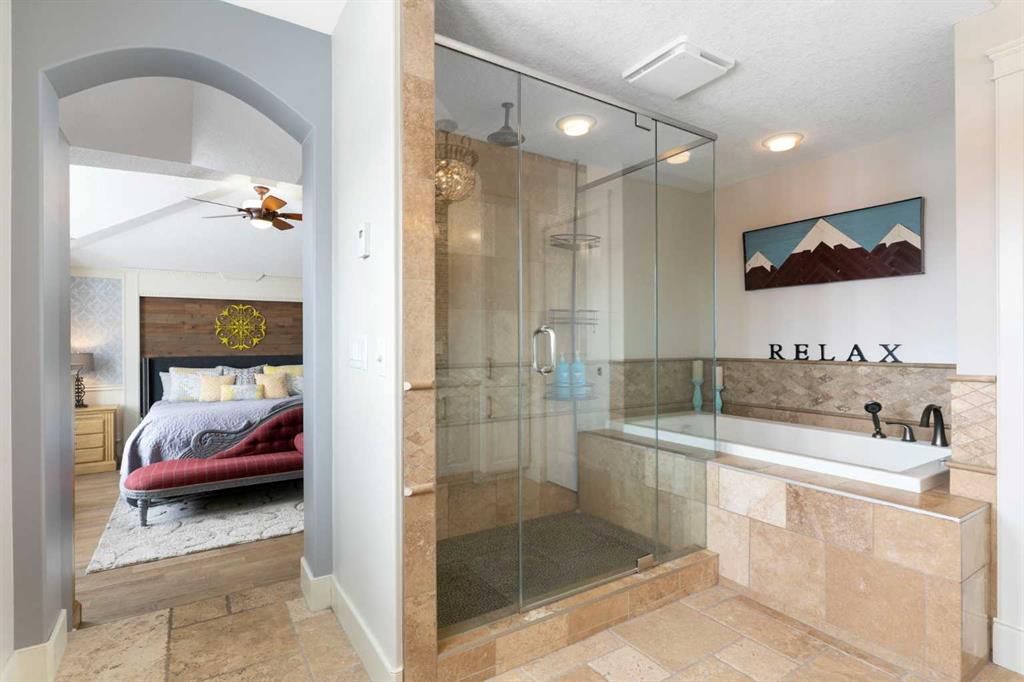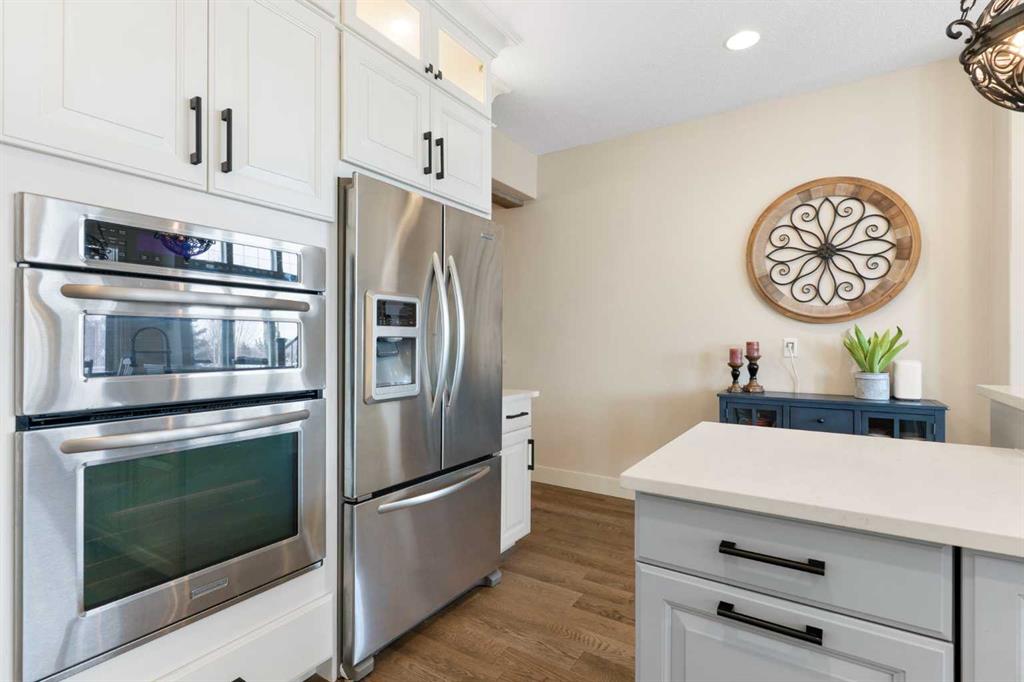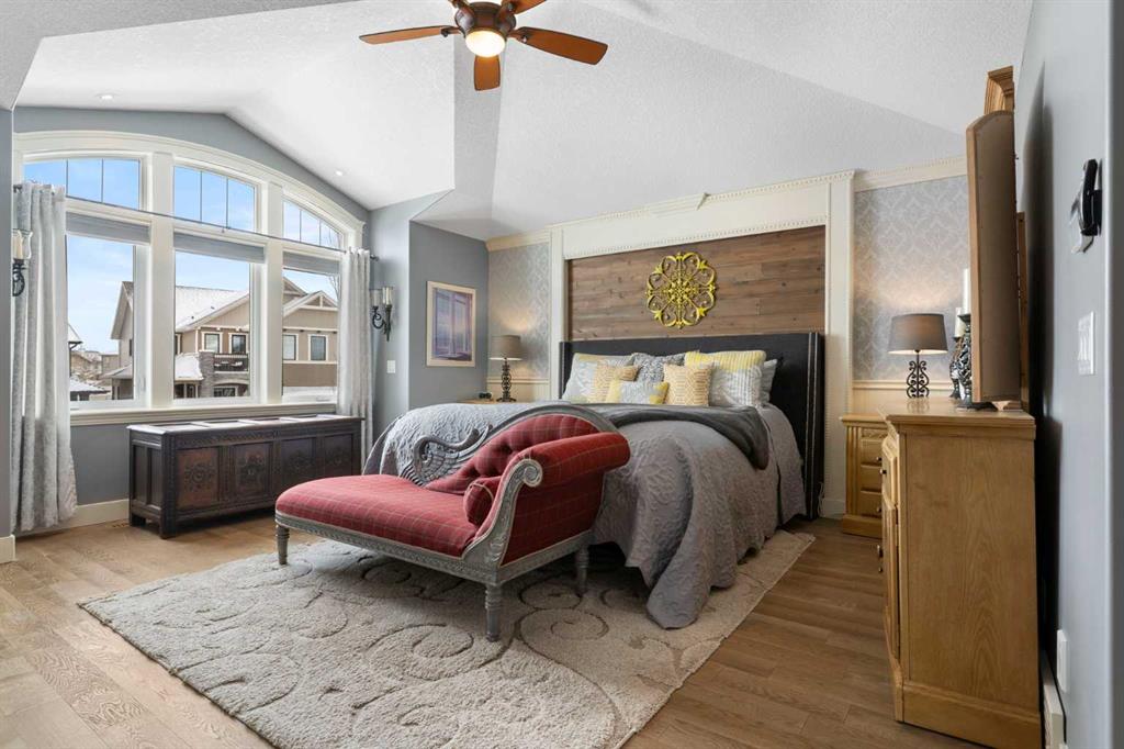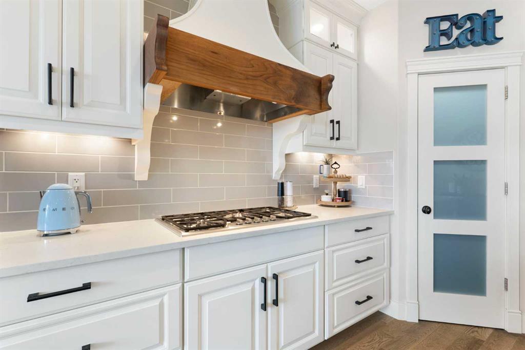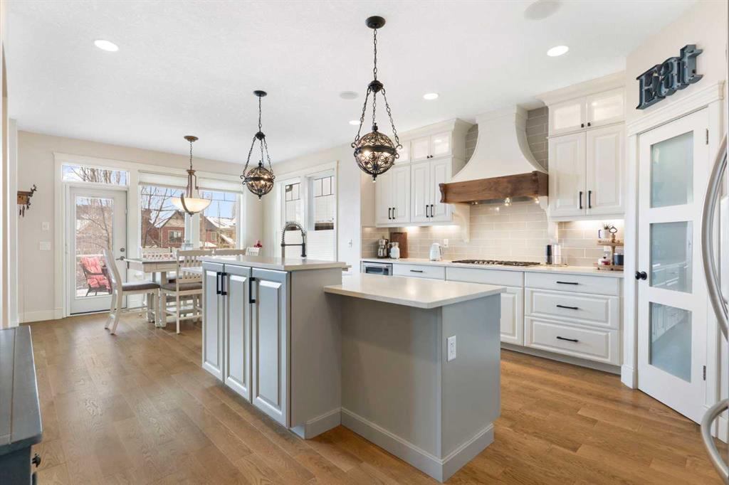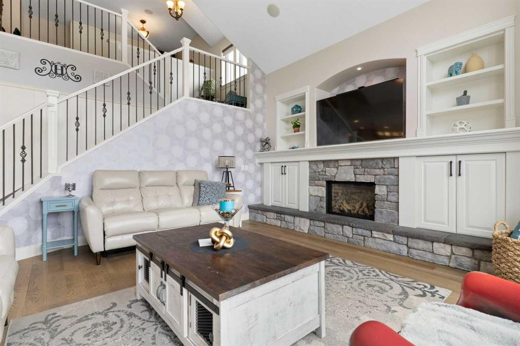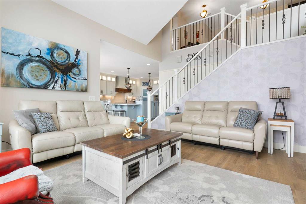 Hello, Gorgeous! Welcome to this beautifully renovated executive walkout home in the highly sought-after community of Coopers Crossing in Airdrie. Offering over 2,500sq ft. above grade plus a fully developed walkout basement, this home blends impressive architectural spaces with thoughtful custom finishes throughout. Step inside to a stunning entry featuring stacked stone accents, rustic beams, and an inviting sense of craftsmanship that continues throughout the home. The main floor includes a private office with glass French doors, perfect for working from home or flexible use as a dining space or additional bedroom. At the heart of the home is the dramatic great room with soaring 14-foot vaulted ceilings, arched windows, and a beautiful fireplace feature wall that fills the space with natural light from the west-facing backyard. The chef-inspired kitchen is designed for both everyday living and entertaining, featuring a large island, quartz countertops, professionally painted two-tone cabinetry, custom organizers, and a striking solid walnut hood fan. Premium appliances include KitchenAid, Bosch, Thermador, and MasterChef, along with a gas range, wall oven, beverage cooler, and walk-in pantry. Upstairs, a welcoming loft creates an additional living space for relaxing or family time. Two spacious bedrooms share a well-appointed bathroom, while the impressive primary retreat offers vaulted ceilings, custom wall detailing, and a luxurious ensuite with heated floors, double vanity, soaker tub & separate water closet. The fully developed walkout basement adds incredible flexibility with a gorgeous second full kitchen, large recreation area, full bathroom, wine/cool room, and a spacious additional bedroom or versatile flex room with built-in Murphy bed. With its high-end finishes and thoughtful layout, this level is ideal for entertaining or multi-generational living. Outdoor living is just as impressive with a west-facing backyard, a 300sq ft. Duradek balcony with glass railing, natural gas line for BBQ, and a walkout patio below with additional gas connections and hot tub rough-in, plus two storage sheds. The beautifully landscaped yard features custom concrete work, mature trees and shrubs, and a 7-zone irrigation system. Completing the home is a triple attached garage plus shop area, with epoxy floors, forced-air heating, workshop wiring, EV/welder outlets, and extensive built-in storage. Located in one of Airdrie’s most desirable communities, close to parks, pathways, schools, and amenities, this exceptional home offers the perfect combination of space, luxury, and functionality.