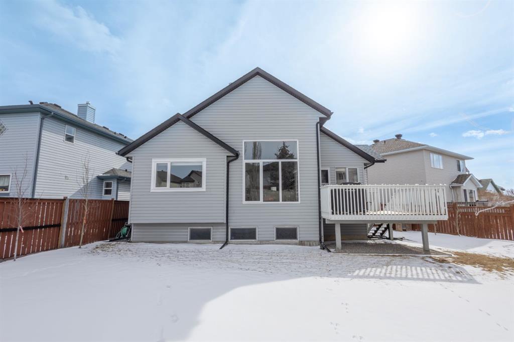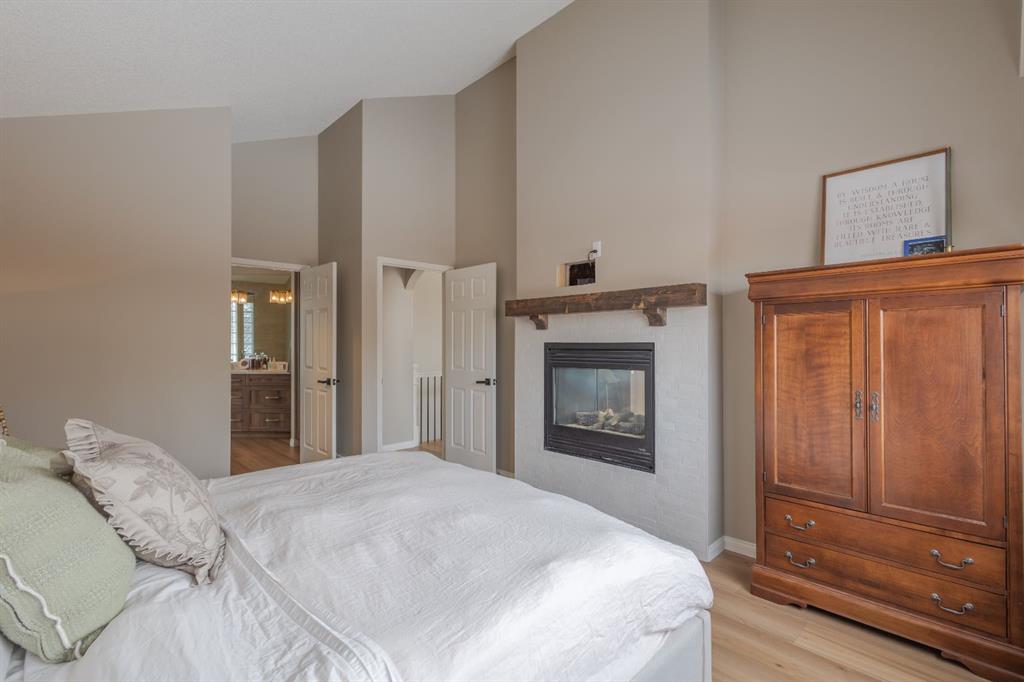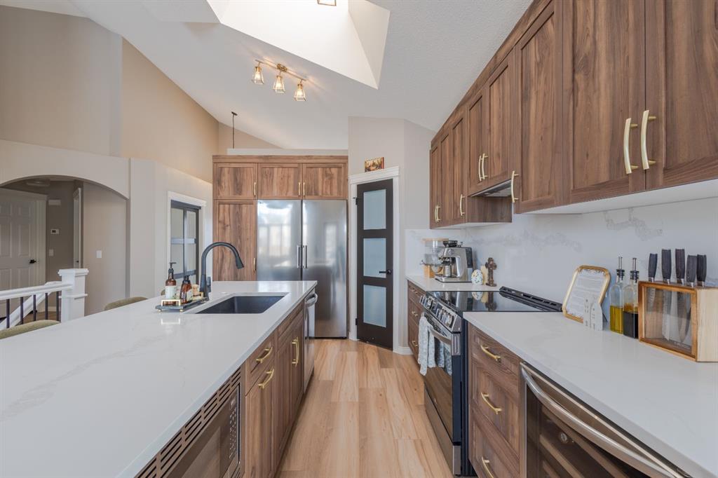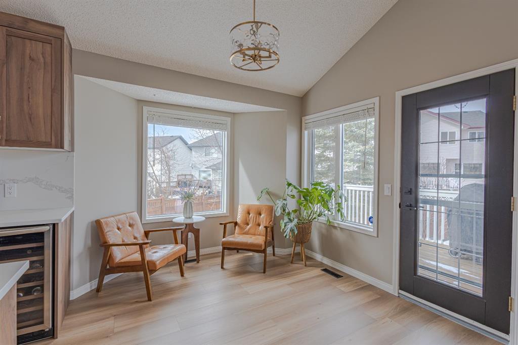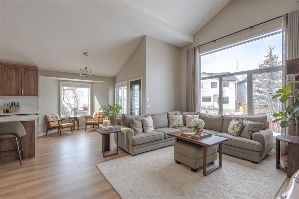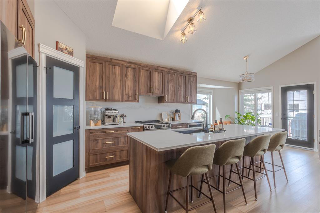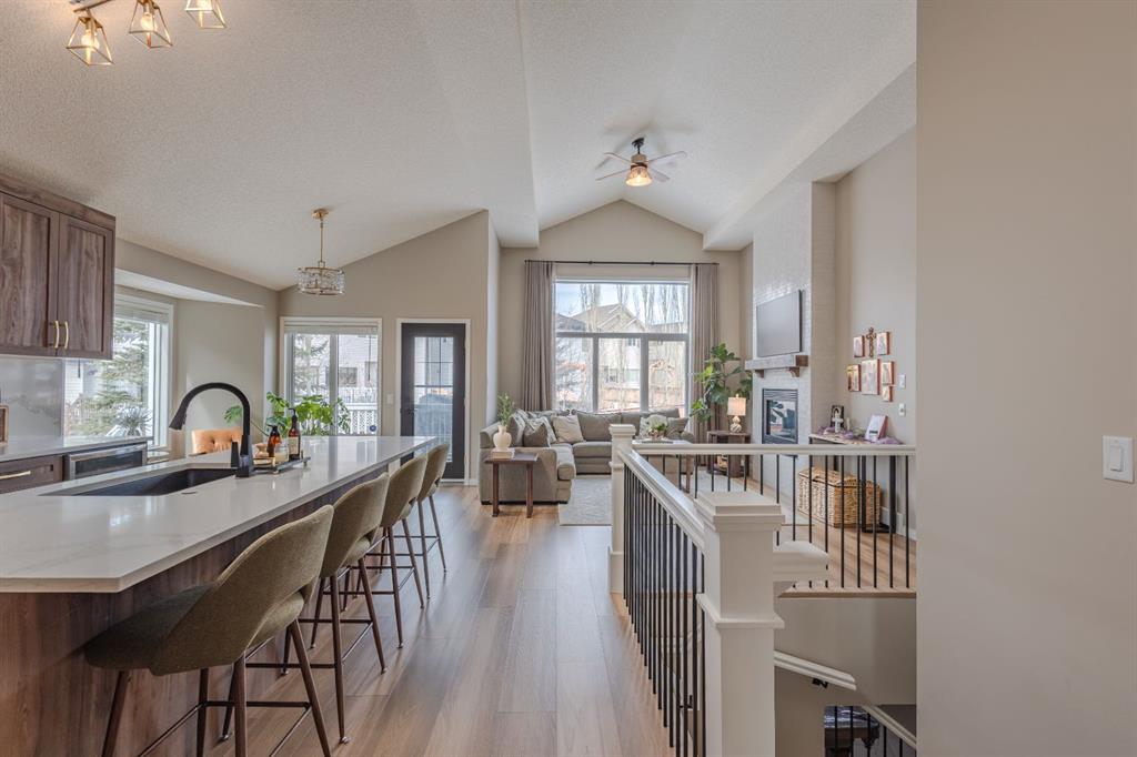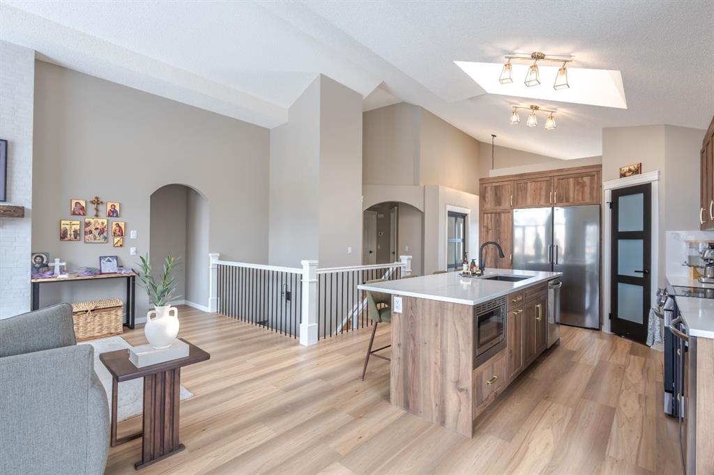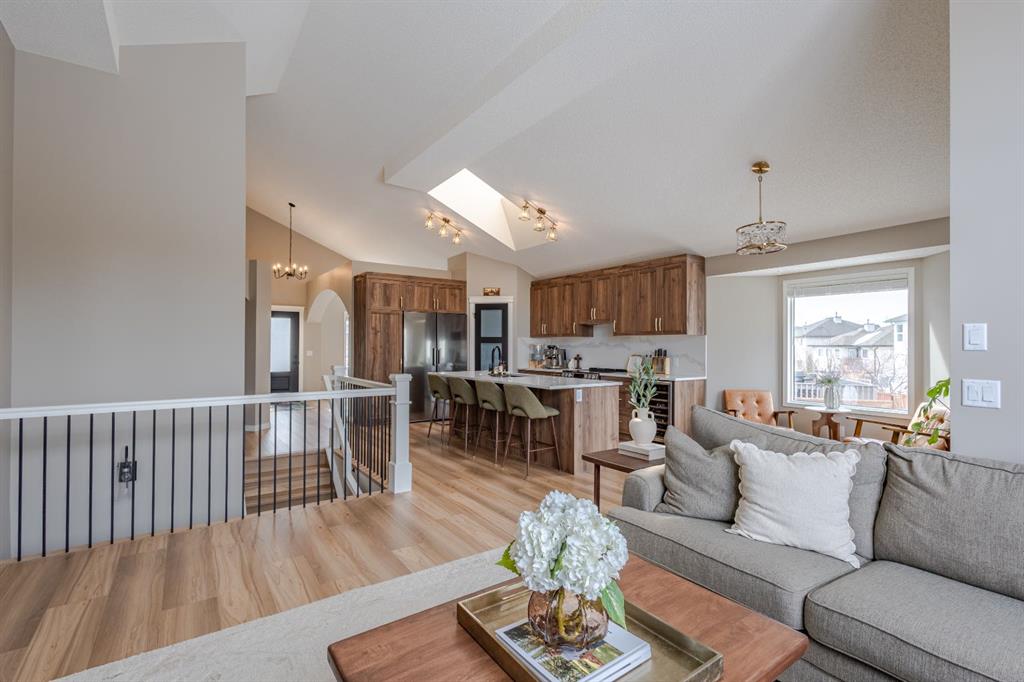 Located in the NW community of Rocky Ridge, this extensively renovated bungalow blends timeless design with modern comfort, set on an impressive pie-shaped lot beautifully enhanced by professional landscaping in 2025. From the moment you arrive, the inviting curb appeal sets the tone for what awaits inside. Stepping inside you are greeted with a grand front dining room space perfect for enjoying meals with family and friends. 16 foot vaulted ceilings elevate the main floor, where a complete renovation has transformed the living spaces into a bright, elegant environment ideal for both everyday living and entertaining. At the heart of the home, the chef-inspired kitchen features brand new stainless steel appliances, a generous centre island, a skylight that floods the room with natural light, and seamless flow to the eating nook area and expansive back deck—perfect for summer evenings and gatherings with family and friends. The living room is warm and inviting, highlighted by a beautiful gas fireplace with tile surround and custom mantle and large windows overlooking the landscaped backyard, including brand new windows in both the living room and primary bedroom. The main floor includes two spacious bedrooms, including a serene primary retreat complete with a walk-in closet and a bright four-piece ensuite boasting a gorgeous standalone shower and dual vanity. A 4pc bathroom and main floor laundry complete this level. Downstairs, the fully developed lower level offers exceptional additional living space with a large family room, second gas fireplace, two additional bedrooms, a full bathroom, and a private sauna for the ultimate at-home relaxation experience. Additional upgrades include new window coverings, a water softener, and a whole-home dechlorinator system, ensuring comfort and quality throughout the home. Completing the property is an oversized double attached garage with added storage and convenient access to the main-floor laundry and mudroom. Beautifully renovated, thoughtfully upgraded, and ideally located, this Rocky Ridge bungalow offers a rare opportunity to enjoy refined single-level living in one of Calgary’s most sought-after NW communities.