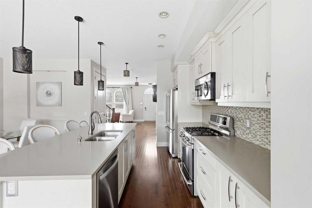 Experience the best of Quarry Park in this former show home, perfectly situated on a quiet boulevard just one block from the scenic Bow River pathways. With over 2,300 sq ft of thoughtfully finished living space up and down, this striking two-storey townhome offers a modern, open layout designed for both everyday living and entertaining. The main floor features a bright, open-concept design with a chef-inspired kitchen showcasing quartz countertops, stainless steel appliances, abundant cabinetry, and a large island for casual dining or gathering. Adjacent dining and living areas flow seamlessly to the private backyard, creating a natural indoor-outdoor connection. Upstairs, three spacious bedrooms include a serene primary retreat with walk-in closet and private ensuite, complemented by upper-level laundry for convenience. The fully finished basement adds a fourth bedroom, full bath, and flexible recreation space. Practical luxury continues with a detached double garage that is fully drywalled and heated—ideal for vehicles, hobbies, or storage. With four bedrooms, 3.5 bathrooms, and a premier Quarry Park location near parks, cafés, restaurants, and pathways, this home delivers refined, low-maintenance living in one of Calgary’s most vibrant communities.
