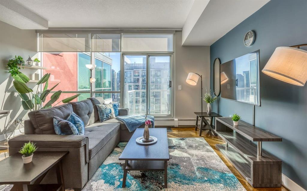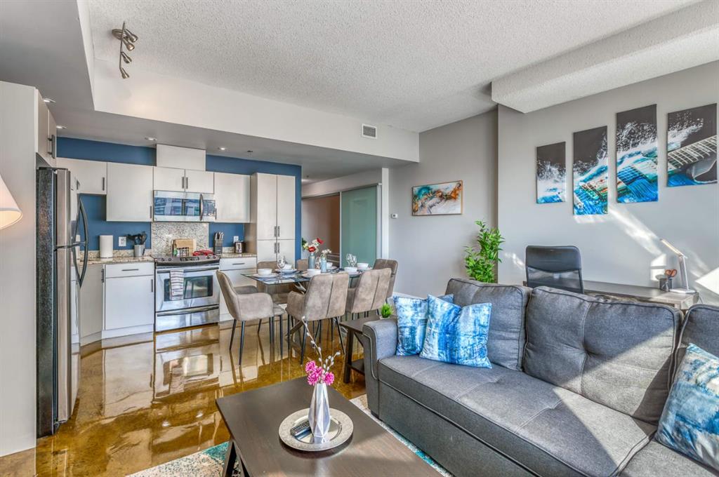Welcome to urban living at its best in the vibrant Colours by Battistella building in the heart of Calgary. This stylish two bedroom, two bathroom sub-penthouse condo offers a bright south-east facing balcony that fills the space with natural light and provides partial views toward the iconic Stampede Park. Designed for both comfort and functionality, the unit features in-suite laundry, convenient in-suite storage, and an open-concept living area perfect for entertaining or relaxing after a busy day. The modern kitchen flows seamlessly into the living and dining space, while the well-separated bedrooms provide privacy for residents or guests. The home also includes a titled parking stall, a valuable convenience for downtown living. Located just steps from the energy of 17th Avenue SW, you’ll enjoy easy access to some of Calgary’s best restaurants, cafés, boutiques, and nightlife. Outdoor enthusiasts will appreciate the proximity to the Elbow River Pathway system for walking and cycling, while commuters benefit from quick connections to downtown and nearby Scotiabank Saddledome and the Calgary Stampede grounds. Adding to its appeal, the building is Airbnb-friendly, offering excellent flexibility for investors or owners looking for short-term rental potential. Whether you're a first-time buyer, investor, or someone seeking a vibrant inner-city lifestyle, this condo delivers the perfect combination of location, convenience, and modern downtown living.