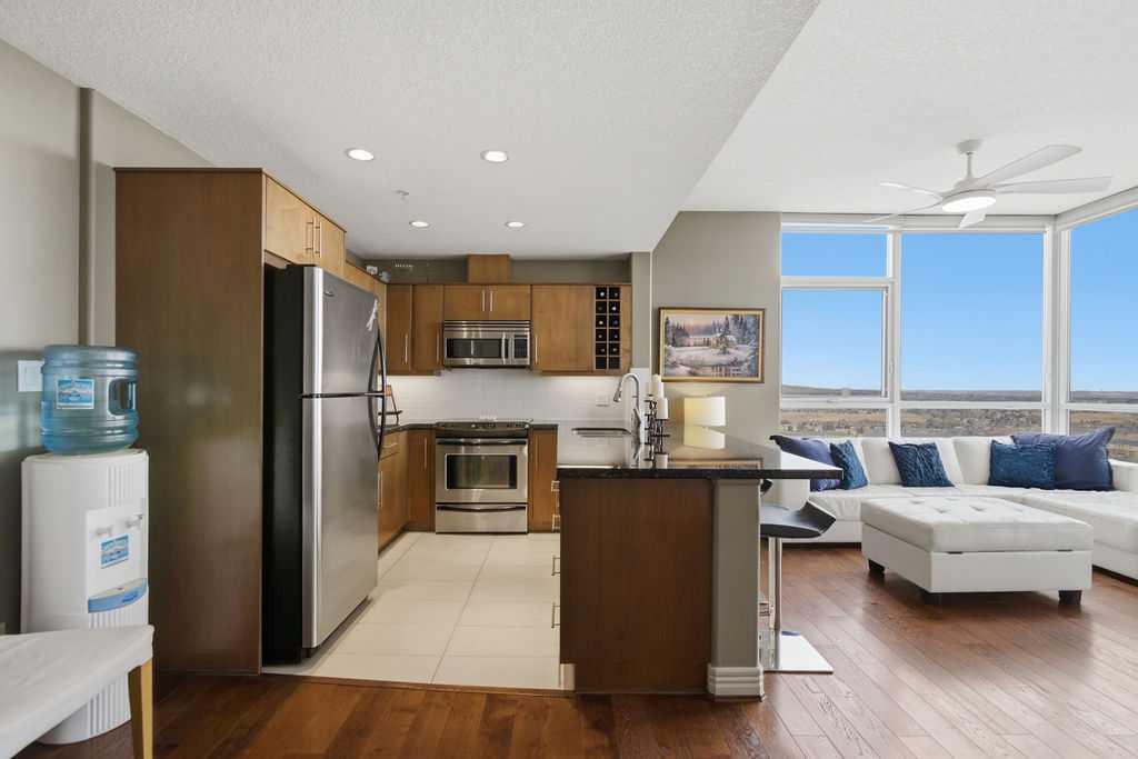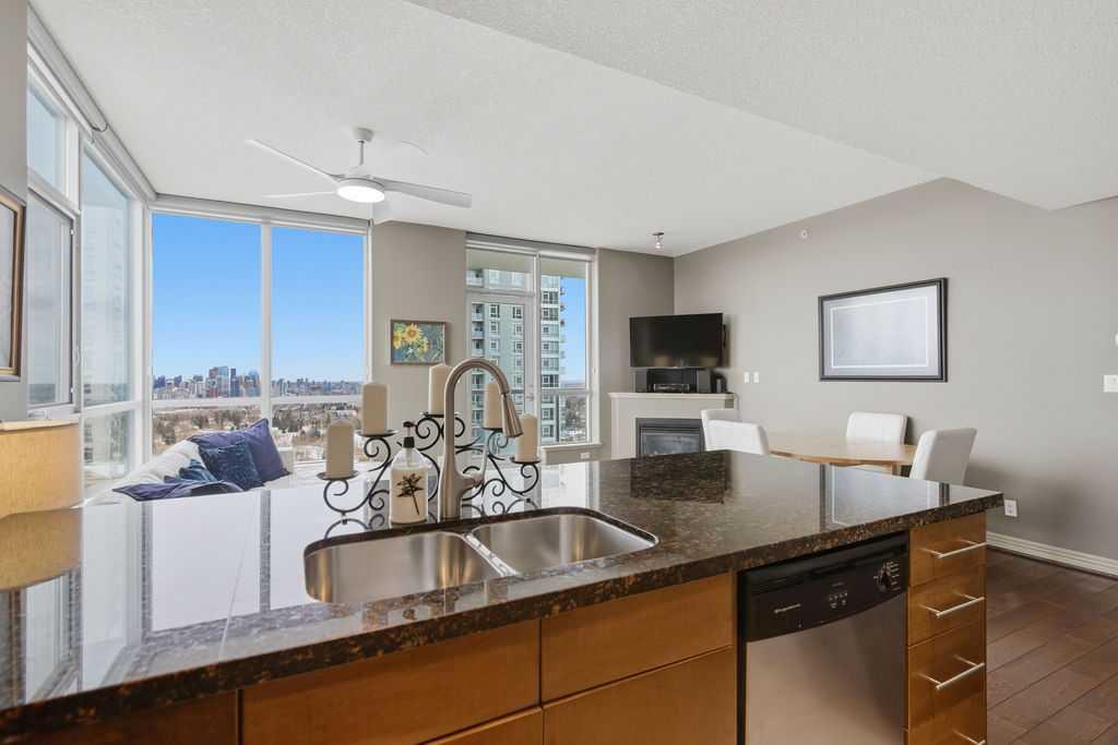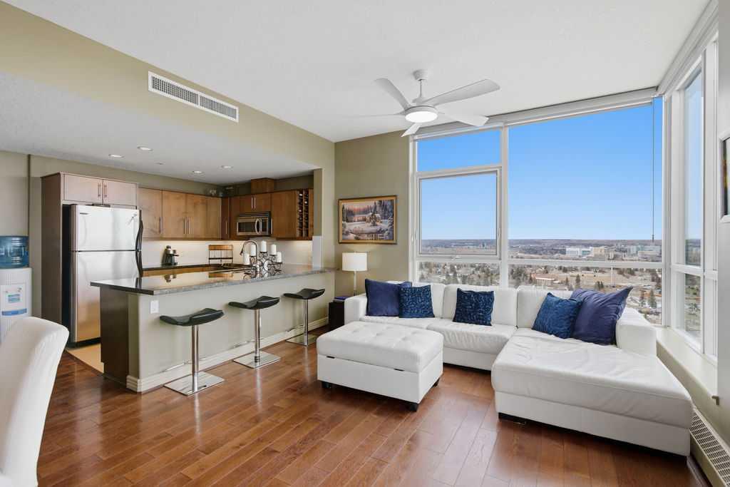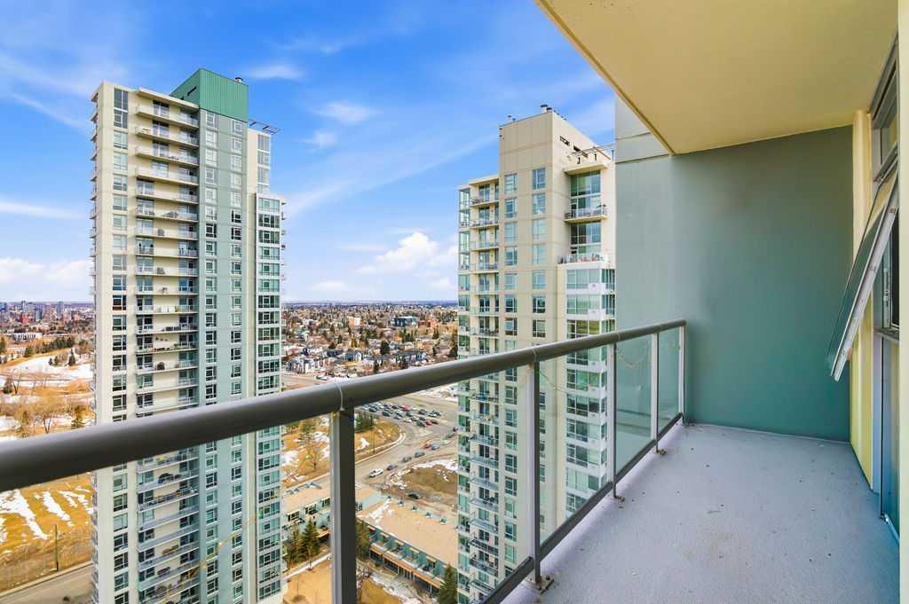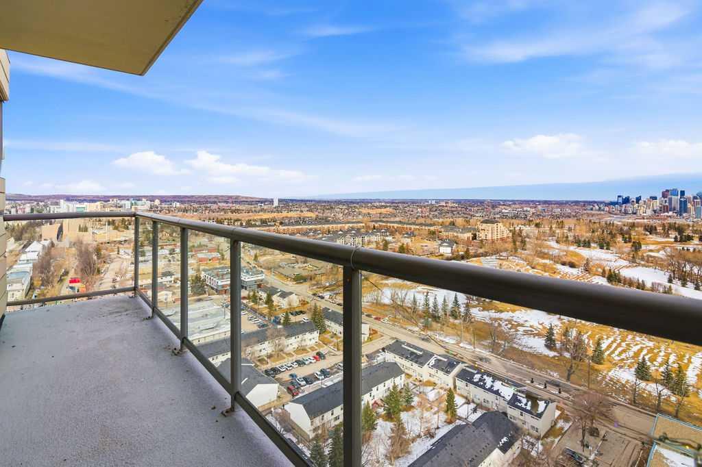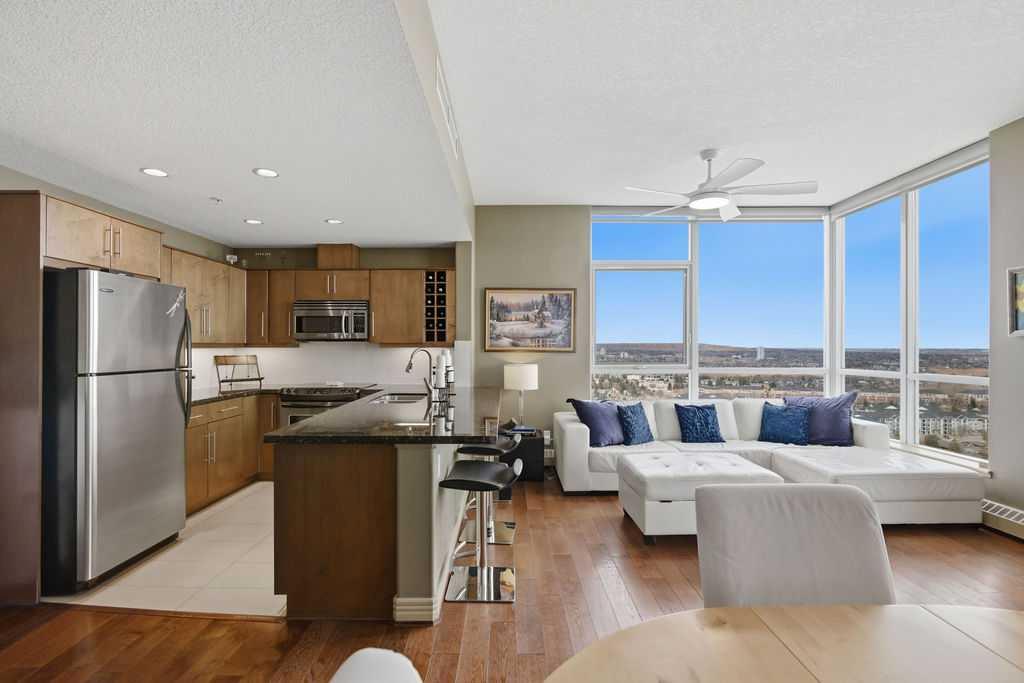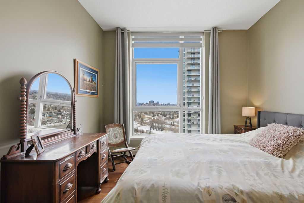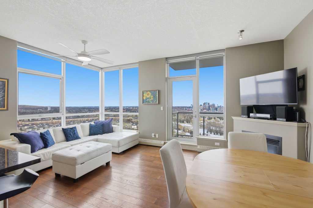 Open House Sunday March 29th 1-3. A rare opportunity to own a corner penthouse with sweeping downtown views and beautiful morning sun. Perfectly positioned with east and north exposure, this bright and spacious two-bedroom, two-bathroom residence captures stunning sunrise light and breathtaking views of Downtown Calgary and the Shaganappi Golf Course through expansive wrap-around windows. The thoughtfully designed open-concept layout features new hardwood and tile flooring, creating a clean and modern feel throughout. The kitchen offers granite countertops and excellent functionality, perfect for everyday living or entertaining. Convenient in-suite laundry is also included. A standout feature is the two titled oversized underground parking stalls, ideally located in the garage and large enough to comfortably accommodate larger vehicles or trucks. Residents enjoy access to an exceptional amenities wing, connected by an indoor walkway, featuring an oversized pool, hot tub, recreation area, and a fully updated fitness centre with sweeping golf course views. This well-managed and secure building offers 24-hour on-site security, underground parking, and underground guest parking for added peace of mind. Located just minutes from the C-Train, shopping, and everyday amenities, this home offers incredible privacy, breathtaking views, and outstanding value for penthouse living in a sought-after building. Pets permitted with board approval (one dog or one cat). This is in the Brava Tower, and condo fees include all utilities except electricity and Internet. call to book a private showing.