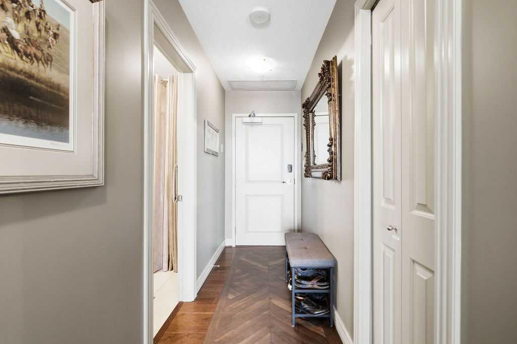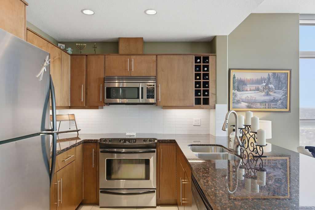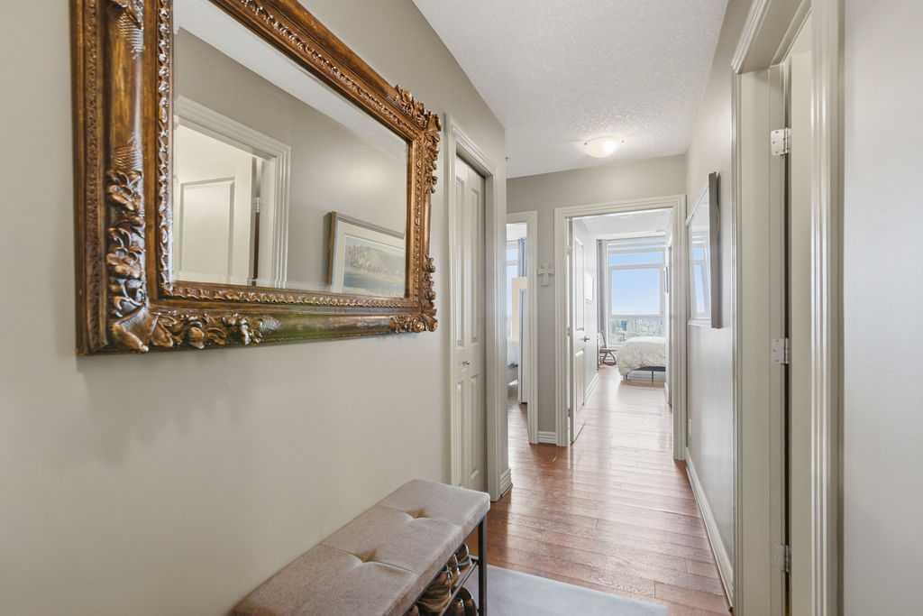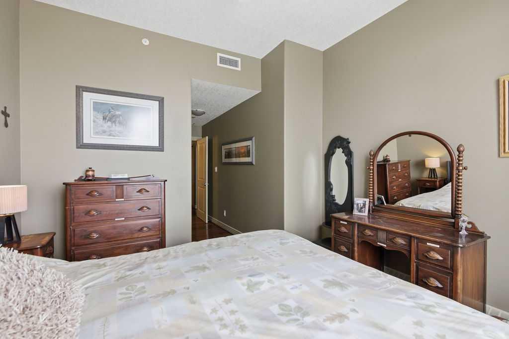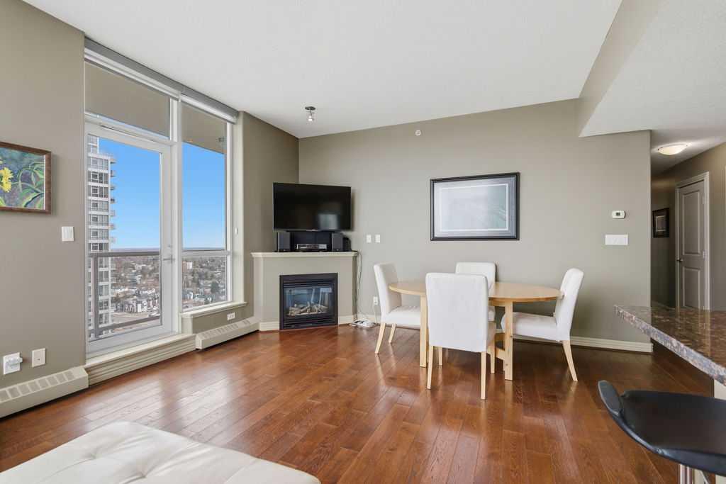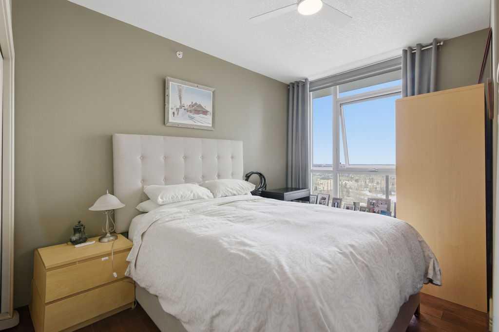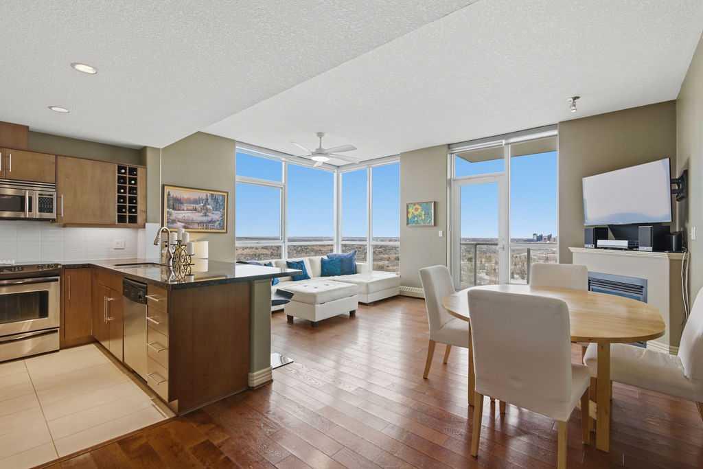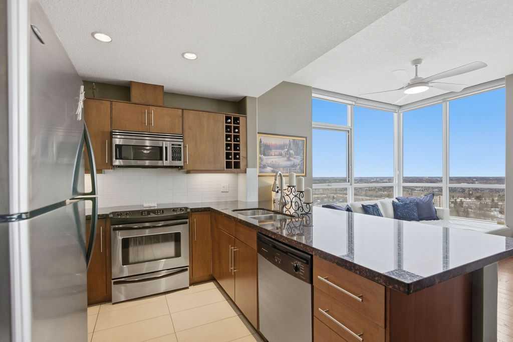 Open House Sunday March 29th 1-3. A rare opportunity to own a corner penthouse with sweeping downtown views and beautiful morning sun. Perfectly positioned with east and north exposure, this bright and spacious two-bedroom, two-bathroom residence captures stunning sunrise light and breathtaking views of Downtown Calgary and the Shaganappi Golf Course through expansive wrap-around windows. The thoughtfully designed open-concept layout features new hardwood and tile flooring, creating a clean and modern feel throughout. The kitchen offers granite countertops and excellent functionality, perfect for everyday living or entertaining. Convenient in-suite laundry is also included. A standout feature is the two titled oversized underground parking stalls, ideally located in the garage and large enough to comfortably accommodate larger vehicles or trucks. Residents enjoy access to an exceptional amenities wing, connected by an indoor walkway, featuring an oversized pool, hot tub, recreation area, and a fully updated fitness centre with sweeping golf course views. This well-managed and secure building offers 24-hour on-site security, underground parking, and underground guest parking for added peace of mind. Located just minutes from the C-Train, shopping, and everyday amenities, this home offers incredible privacy, breathtaking views, and outstanding value for penthouse living in a sought-after building. Pets permitted with board approval (one dog or one cat). This is in the Brava Tower, and condo fees include all utilities except electricity and Internet. call to book a private showing.