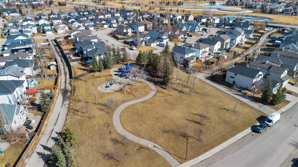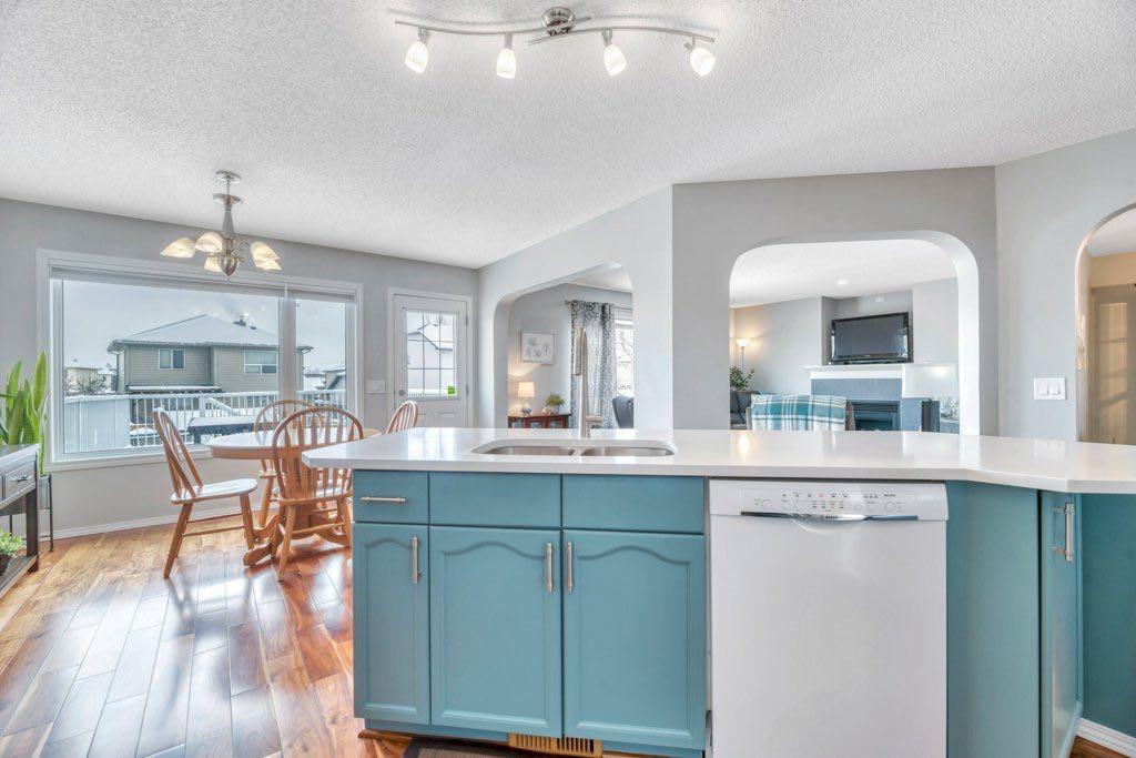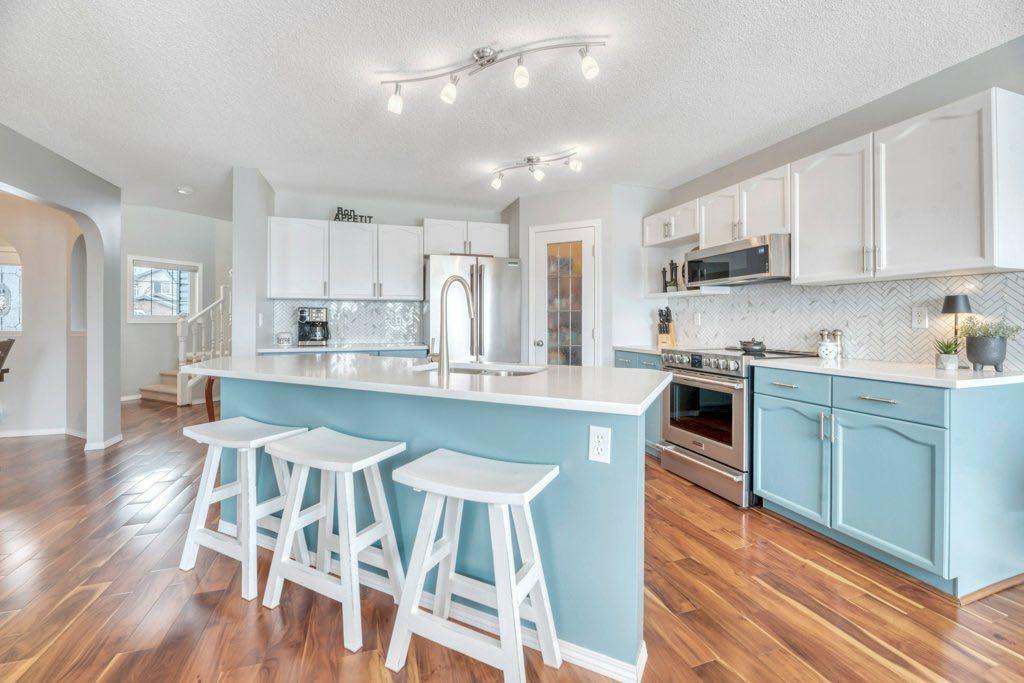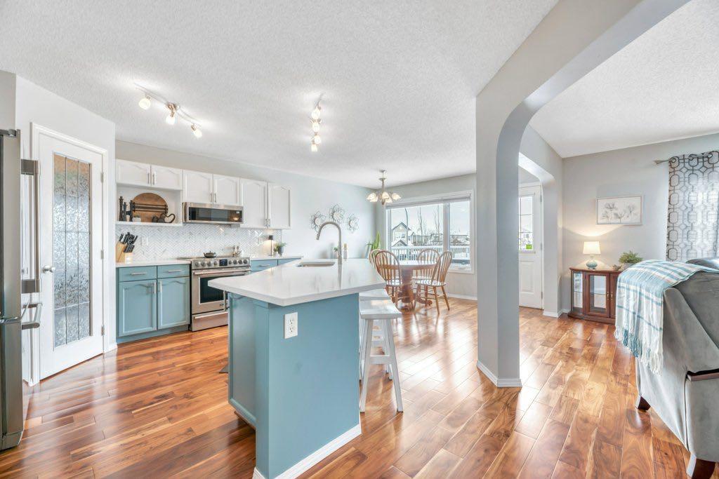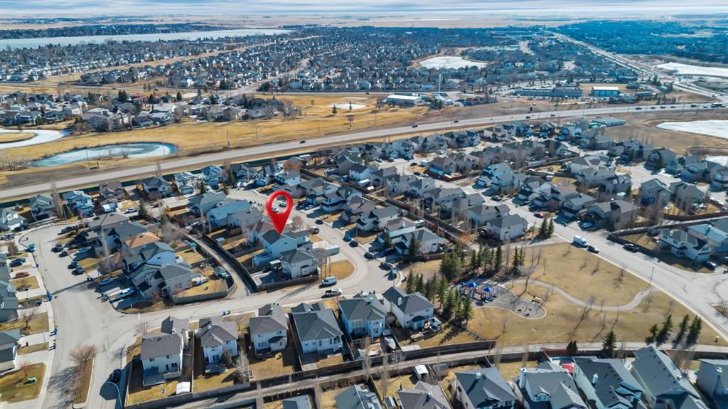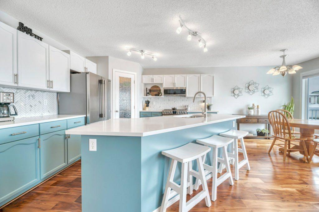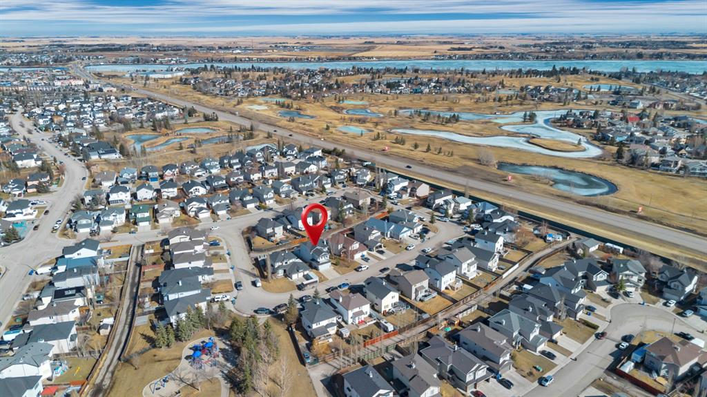 This picture perfect 2 story home in popular Westmere has been lovingly maintained and beautifully upgraded. Step into the front foyer where soaring ceilings and tons of natural light instantly give you that welcome home feeling. A front flex room with arched openings can be used as a formal dining room, home office or maybe a cozy reading nook or music room. The kitchen is like a breath of fresh air with cheery blue and white painted cabinets, white quartz counters, herringbone tile backsplash, stainless steel fridge & stove, a corner pantry and large island with seating. The kitchen is open to both the eating area and the cozy living room complete with a gas fireplace for warmth and ambience. The open layout is ideal for both everyday living and entertaining. An abundance of natural light, and gorgeous rich wood flooring throughout make this space feel bright and open. A 2 pc powder room and laundry are discreetly tucked a couple of steps down from the main level and conveniently situated close to the garage entry. Upstairs you’ll first come to the bright and sunny bonus room located on its own level. This room features a vaulted ceiling, tons of windows and the best little covered deck where you can relax with your morning coffee or curl up with a book and enjoy a beautiful sunset with a glass of wine. This just might be the best room in the house. Up a few more stairs you’ll find 3 generous bedrooms including the spacious primary retreat complete with 4 pc ensuite with soaker tub and a nice walk in closet. The other 2 bedrooms share the main bath and there is a nice sized storage closet in the main hall. The fully finished basement offers endless opportunities to expand your living space as needed and 9’ ceilings and large windows make it bright and welcoming. This is a nice sized family room complete with a cozy gas fireplace and an additional area connected could be used as a games room, kids playroom or home gym. This space could quite easily be converted to a 4th bedroom if needed and the storage room right next to it is roughed in for a bathroom. Outside you’ll enjoy a large backyard that is almost fully fenced and the large deck off the kitchen and eating area has enclosed storage underneath. There is plenty of room for kids and pets to play in the yard plus a back lane behind means that you can store a boat, ATV or small RV in your yard. There is also 220 amp power available if you want to run power to a small shop, shed or hot tub. This home is in an ideal location close to shopping, restaurants, bars, gyms, the library, the lake & beach as well as the many gorgeous parks and pathways Westmere has to offer including a huge off leash dog park. There is even a playground just down the street. Plus you are close to both major routes in and out of Chestermere for an easy commute. Don’t miss your chance to call this beautiful home yours.
