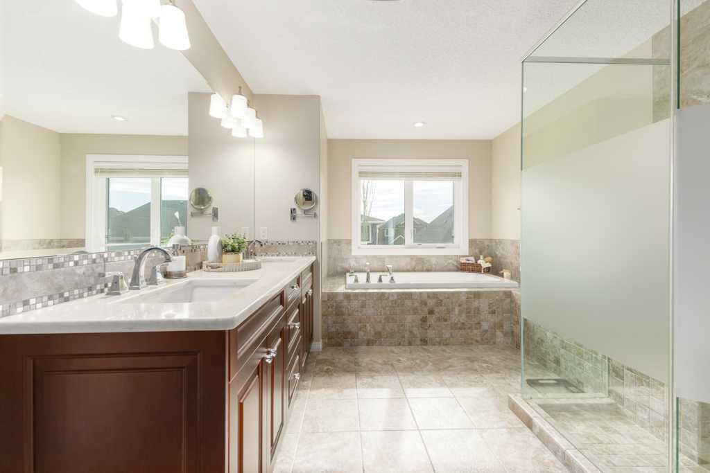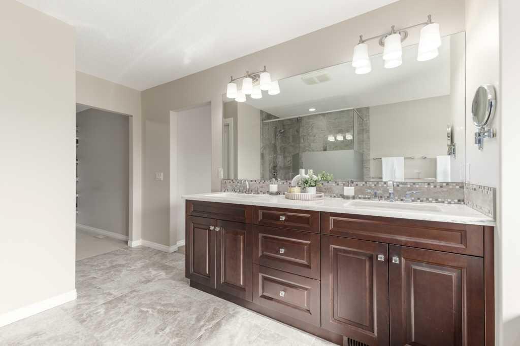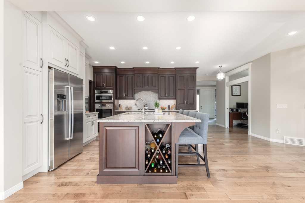 Exceptional custom-built estate by Albi Homes offering 5 bedrooms, 4.5 bathrooms, and over 4,400 sq. ft. of beautifully developed living space, ideally located on a quiet street in Aspen Rose within prestigious Aspen Woods. With 3,055 sq. ft. above grade plus a professionally finished 1,392 sq. ft. basement, this stunning home blends timeless design with everyday functionality and includes A/C for year-round comfort. The main level showcases a sophisticated formal dining room, private home office, functional mudroom, and an inviting living room anchored by a striking travertine stone fireplace. At the heart of the home is a chef-inspired kitchen featuring granite countertops, Legacy cabinetry, premium Bosch appliances, a gas cooktop, built-in wall oven and microwave, a spacious walk-in pantry, and an elegant Carrara herringbone backsplash. Engineered hardwood flooring and rounded wall corners add warmth and architectural character throughout. Upstairs, you’ll find three generously sized bedrooms, each complete with its own walk-in closet and private ensuite, along with the convenience of upper-level laundry. The professionally finished basement by Albi Homes adds exceptional flexibility with two additional bedrooms, a full bathroom, a large recreation room, and ample storage. A triple garage offers abundant space for vehicles and storage. The beautifully landscaped south-backing yard is a true outdoor retreat, designed for both relaxation and entertaining with a great deck, stone patio, and fire pit, all framed by mature trees that provide privacy and a serene setting with all-day sun. Perfectly positioned in one of West Calgary’s most desirable communities, this home offers outstanding access to Aspen Landing Shopping Centre, the West LRT, Stoney Trail, and Bow Trail. Nearby schools include Roberta Bondar School, Ernest Manning High School, Webber Academy, and Rundle College, with Mount Royal University, the University of Calgary, SAIT, and Ambrose University also within easy reach. Some images have been virtually staged.