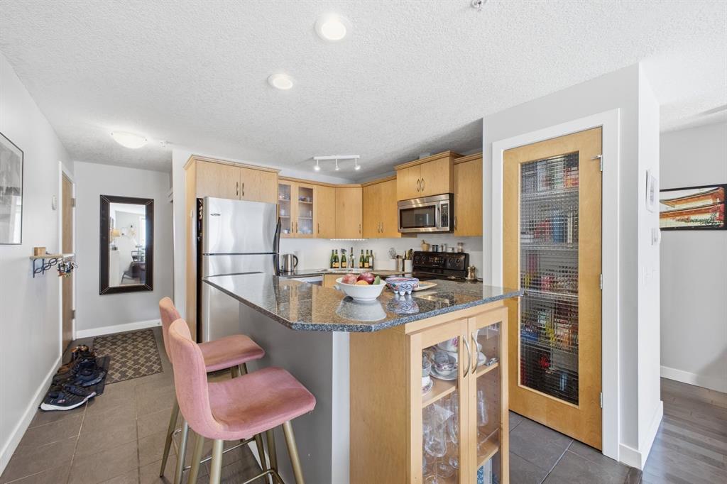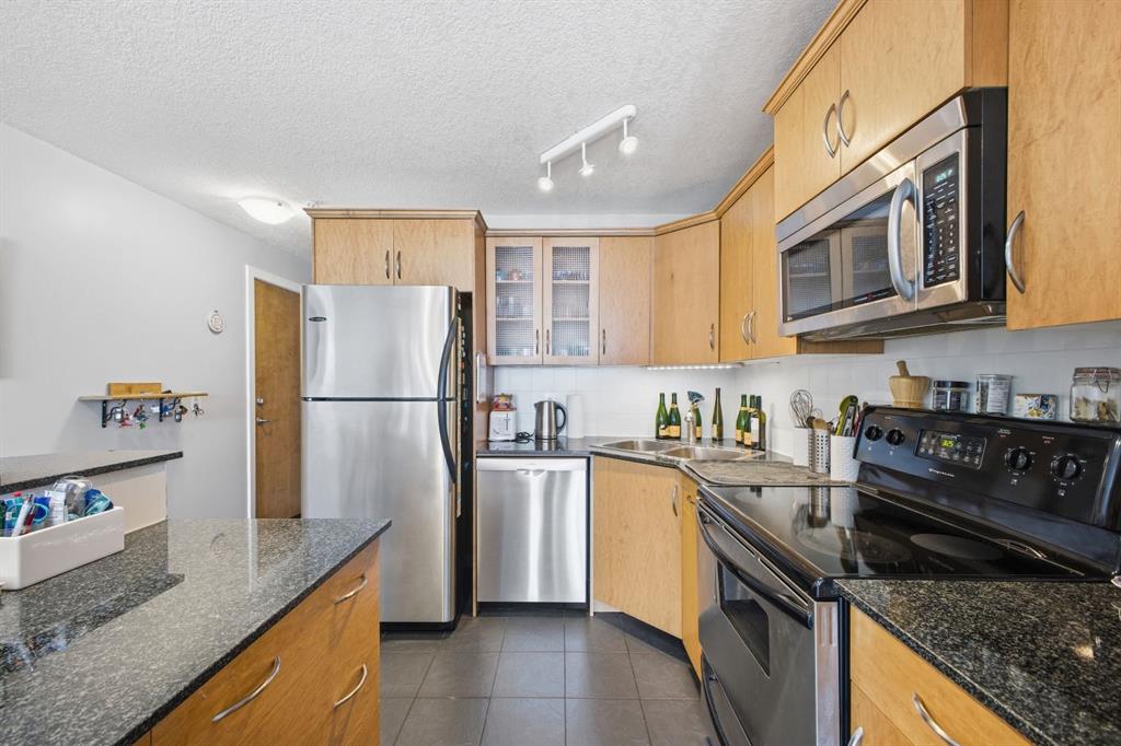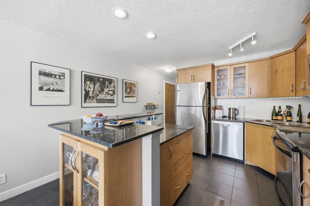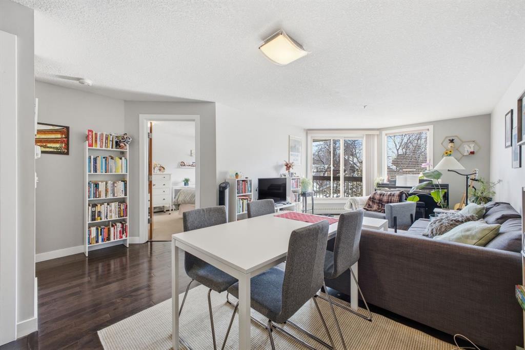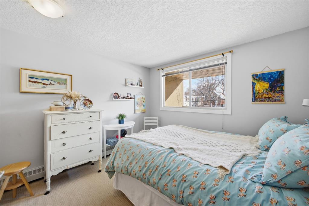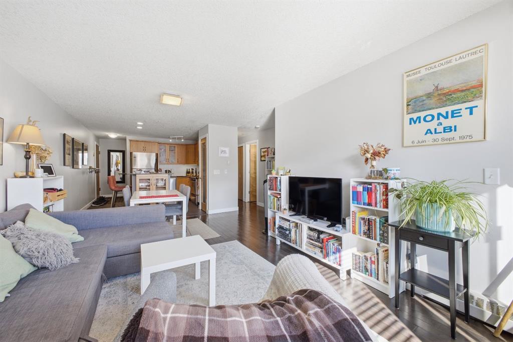 Charming 2-bedroom, end-unit, concrete construction condo with a sunny south-facing balcony, perfectly positioned in the heart of Mission. This inviting home features an open layout with hardwood and tile flooring, a well-appointed kitchen with granite countertops, an island with seating, stainless steel appliances, a pantry, and a comfortable dining area. The spacious living room opens directly onto the balcony, creating an effortless indoor–outdoor connection. Both bedrooms offer generous closet space, and the updated 4-piece bathroom adds a fresh, modern touch. Additional conveniences include in-suite laundry, titled underground parking, an assigned storage locker, and the value of all utilities included in the condo fee. The location is exceptional—just steps to the vibrant shops, restaurants, cafes, and pubs along 17th Avenue and 4th Street, with easy access to public transit, the MNP Community & Sport Centre, Stampede Park, and the scenic river pathways.