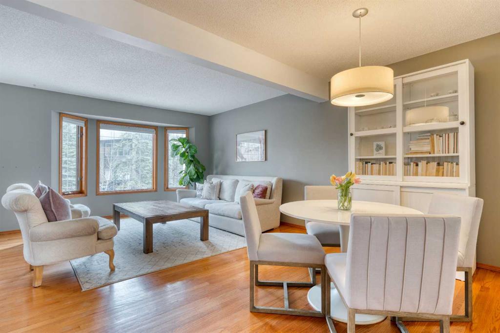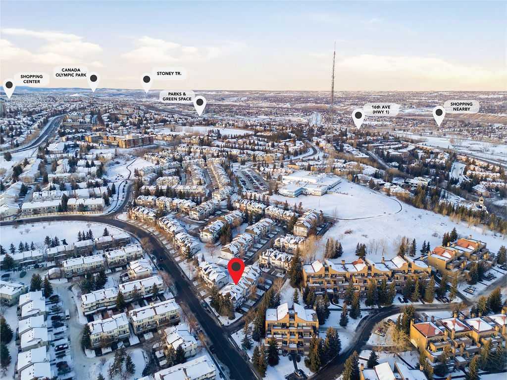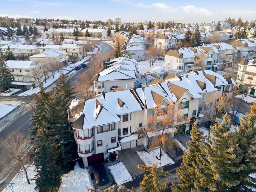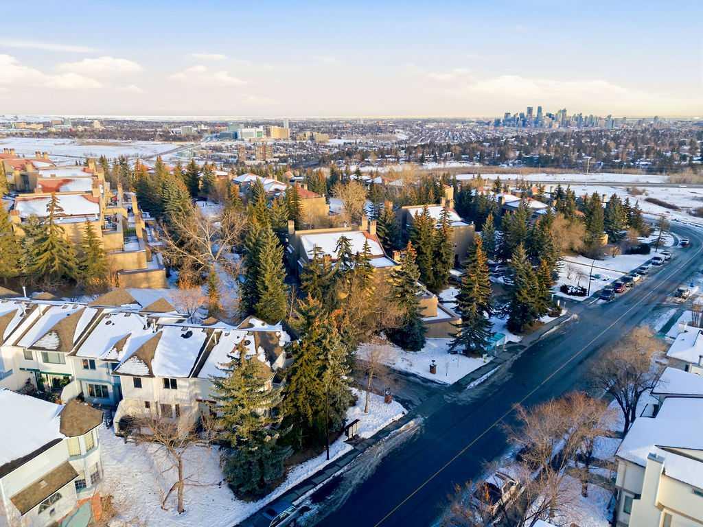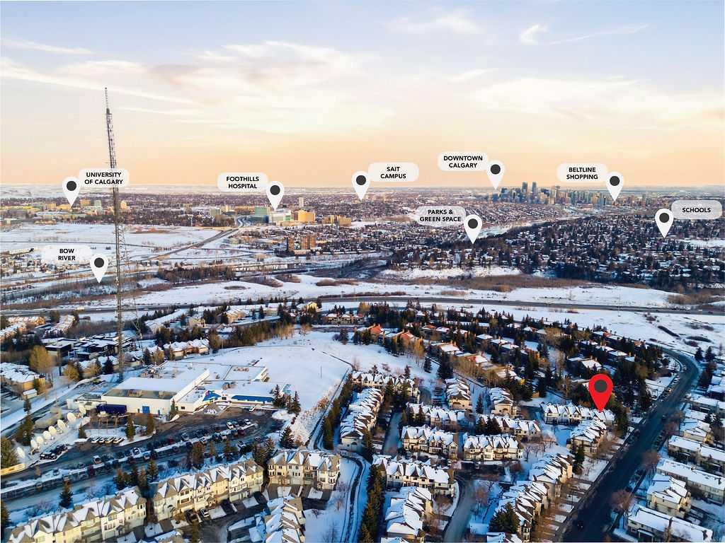 Welcome to 5 Patina Point SW, a tastefully updated 2 bedroom, 1.5 bath townhome offering 1,340 sq. ft. of comfortable living space in the highly desirable community of Patterson on Broadcast Hill. Surrounded by mature trees, abundant green spaces, and sweeping city views from the community, this location offers the perfect balance of convenience and nature right outside your front door. Step inside to a functional foyer entry that leads up to the open concept main living area, where you’ll find solid oak hardwood floors, a wall of bay windows overlooking the trees, filling the space with natural light, and a cozy gas fireplace offering an inviting setting for relaxing evenings or hosting family and friends over the holidays. The updated kitchen features oak cabinetry, custom concrete countertops, a generous island, and direct access to the private back deck overlooking a green space the ideal spot for morning coffees or warm summer dinners. Upstairs, you'll find a very large primary bedroom with a custom feature wall, a second well-sized bedroom, and an updated 4-piece bathroom complete with a large corner soaker tub. A bright loft area offers the perfect spot for a home office, reading nook, or additional family lounge space. The attached double garage provides secure parking for two vehicles plus a driveway stall, making parking effortless and storage abundant, a rarity with inner city living! Perfectly positioned just steps from transit, minutes to downtown, and with easy access to the mountains, this townhome offers an unbeatable lifestyle and value. Don’t miss your chance to own in one of Calgary’s most sought after communities!