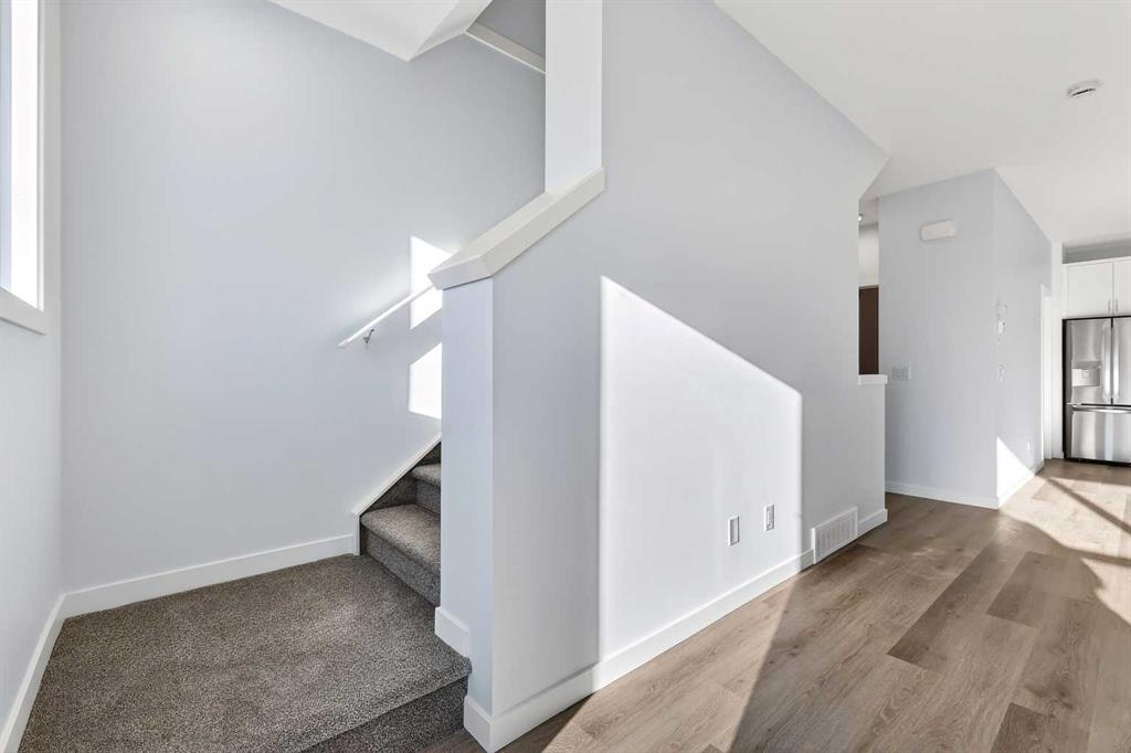StreetSide proudly presents this exceptionally popular interior-unit townhome, where expansive living areas meet modern comforts and sophisticated finishes. The thoughtfully designed floorplan features three spacious upper-level bedrooms and two and a half well appointed bathrooms, complemented by a versatile lower-level den perfect for a home office or quiet retreat. The heart of the home is an inviting open-concept main floor, anchored by a large gourmet kitchen featuring a functional breakfast bar for casual dining. This bright living space transitions seamlessly to a private balcony, offering a perfect setting for outdoor relaxation. The interior showcases high end craftsmanship, including modern white slab-style cabinetry with a full bank of drawers for maximum storage. The kitchen is further elevated by polished white quartz countertops and a full suite of premium stainless steel appliances. Durable luxury vinyl flooring runs throughout the primary living areas, while the stairs and upper level are finished with plush carpet over an 8lb underlay for superior comfort. Additional conveniences include an attached double car garage, professionally maintained landscaping, and a lifestyle defined by maintenance free living. Located within Red Embers Point East, this home places you at the heart of the dynamic Redstone neighborhood. Enjoy the ease of a convenient location with quick access to major routes, including Stoney Trail, ensuring you are never far from the city's best. The community is strategically positioned near future commercial developments, promising shops, services, dining, and entertainment options just moments from your doorstep.