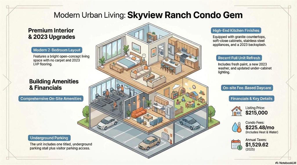 What a Gem! Yes - this one is as good as it looks! This BRIGHT and well-maintained 2-bedroom, 1-bath condo is located on the second floor and features UPGRADED LVP FLOORING (2023) and a functional open-concept layout that maximizes space and NATURAL LIGHT. The 2-bed layout offers flexibility, with the second bedroom also ideal as a home office or den. All of this comes with EXTREMELY LOW CONDO FEES! Enjoy your PRIVATE north-facing BALCONY, perfect for morning coffee or evening relaxation. The kitchen is finished with GRANITE COUNTERTOPS, SOFT-CLOSE CABINETS, upgraded STAINLESS-STEEL APPLIANCES, and a NEW TILE BACKSPLASH with UNDER-CABINET LIGHTING (2023). Recent updates include FRESH PAINT and a NEW WASHER (2023). This secure building offers UNDERGROUND PARKING, VISITOR PARKING, plus amenities including a FITNESS CENTER, COMMON/PARTY ROOM, and an ON-SITE DAYCARE (fee-based)! Located near schools, shopping and major routes! Hurry Up!