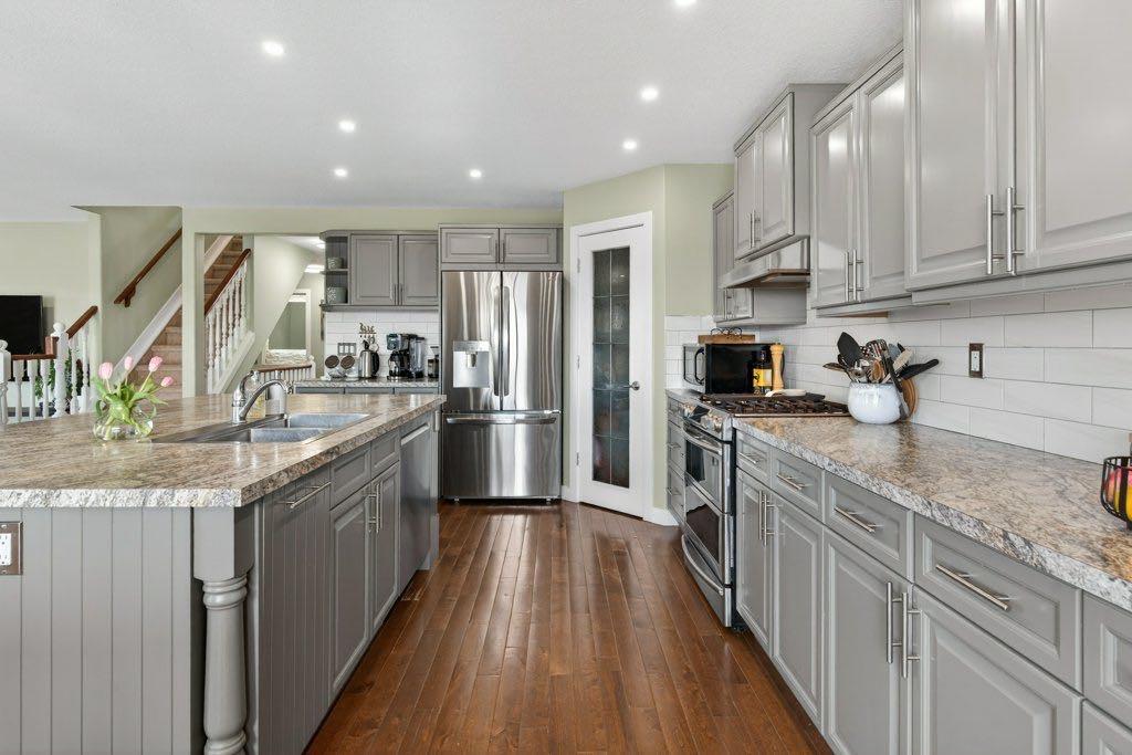 WOW! Check this place out: lake privileges, walking distance to four schools, and stunning mountain views. Located in Crystal Shores, this substantially renovated two-storey offers over 3000 square feet of finished living space with a thoughtful layout and updated finishes throughout. Hardwood floors run through the main level, adding warmth and continuity to the open design. As you enter, the living room immediately stands out with its open-to-above ceiling and two storeys of windows that bring in natural light and offers a sunny spot to enjoy the company of friends. The kitchen is designed for both daily living and entertaining, featuring a large island, a corner pantry, and ample cabinetry. The stainless steel appliances feature a French-door fridge with ice and water, LG dishwasher and a dual-fuel, dual-oven gas range. Connected seamlessly to a generous dining area that comfortably accommodates large gatherings while maintaining a sense of openness to the family room. The deck on this level has gas hook-up for four-season barbecuing. The private office on the main floor offers a quiet place to work or study and the attached garage enters into a seriously impressive mudroom with laundry and more amazing storage. Upstairs, four bedrooms provide flexibility for families or guests. The primary suite is positioned to take advantage of the south-facing exposure and includes access to a private balcony where you can take in the stunning mountain view. The additional bedrooms are well-proportioned and share access to a full bathroom, creating a functional upper level that balances space and privacy. The walkout basement is fully finished and extends the living space with a fifth bedroom, a wet bar, a dedicated TV room and workout area. This level offers versatility, whether used for entertaining, accommodating guests, or as a retreat for everyday living. Outside, the backyard backs directly onto a walking path, creating a natural extension of the indoor space and a sense of openness. The yard has been set up with both usability and enjoyment in mind, featuring a raised garden bed and well-planned landscaping. The setting allows for clear mountain views, adding to the overall appeal without feeling removed from the surrounding community. With its combination of updated interiors, functional layout, and a location that offers both views and access to pathways, this home presents a well-rounded opportunity in one of Okotoks’ established neighbourhoods. All of this with gorgeous views and lake access.