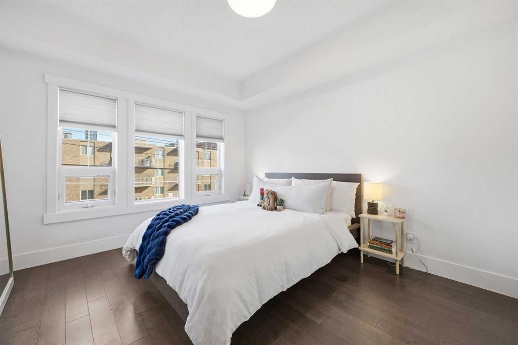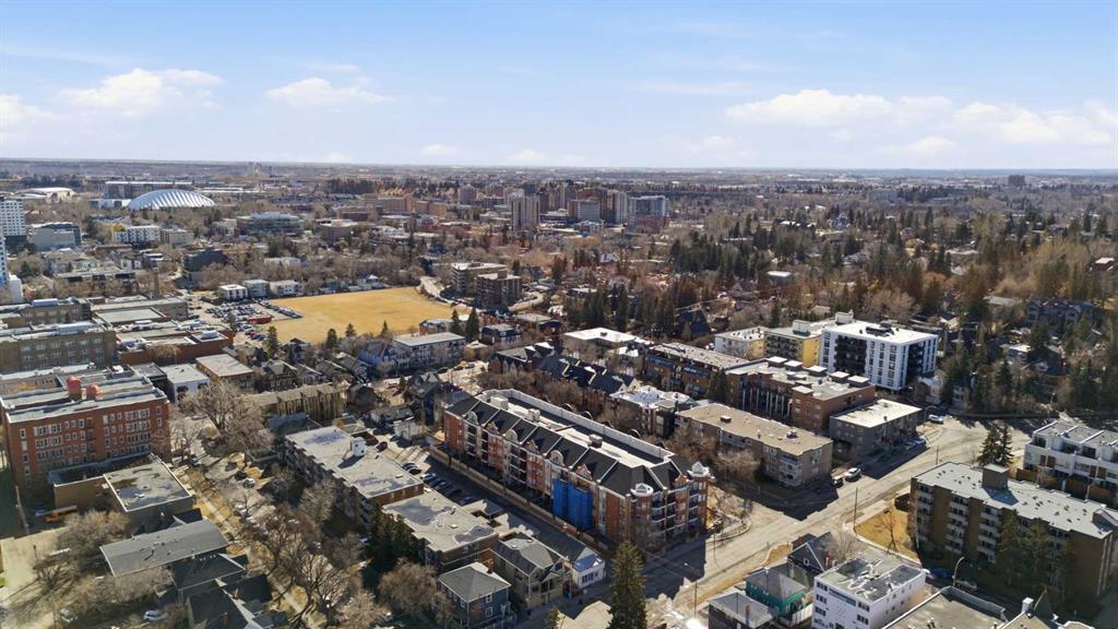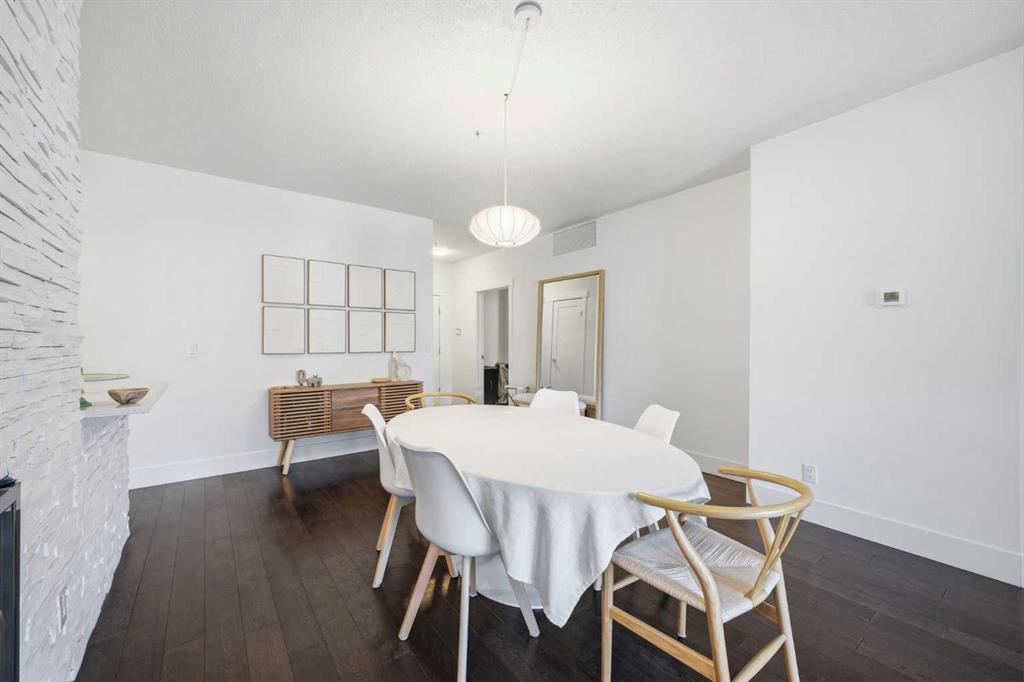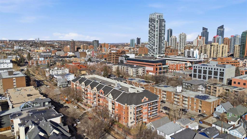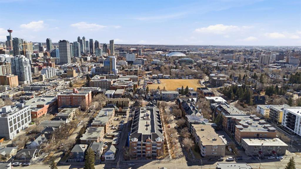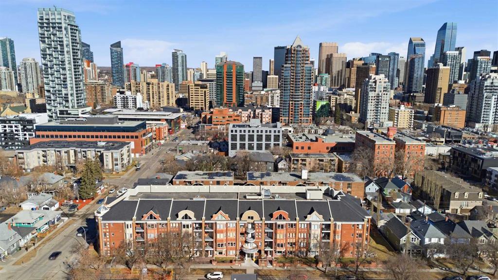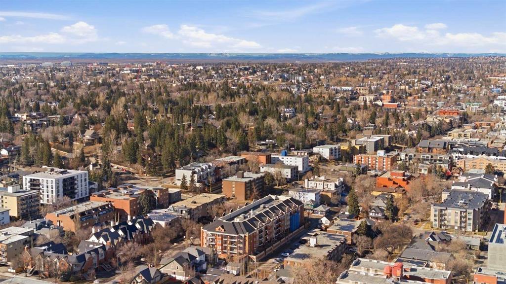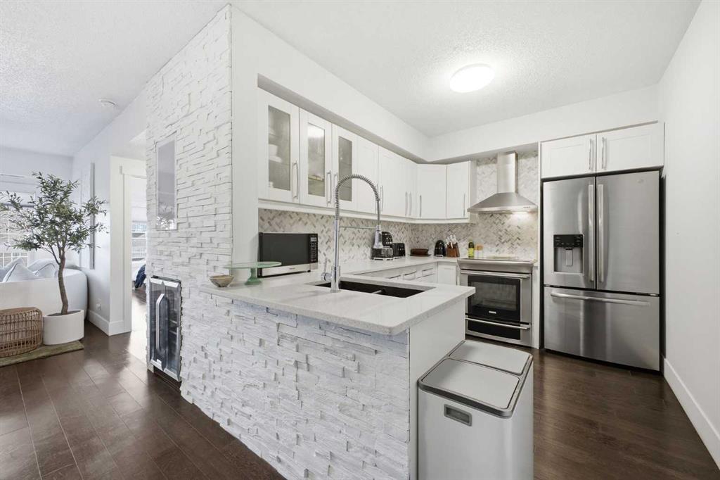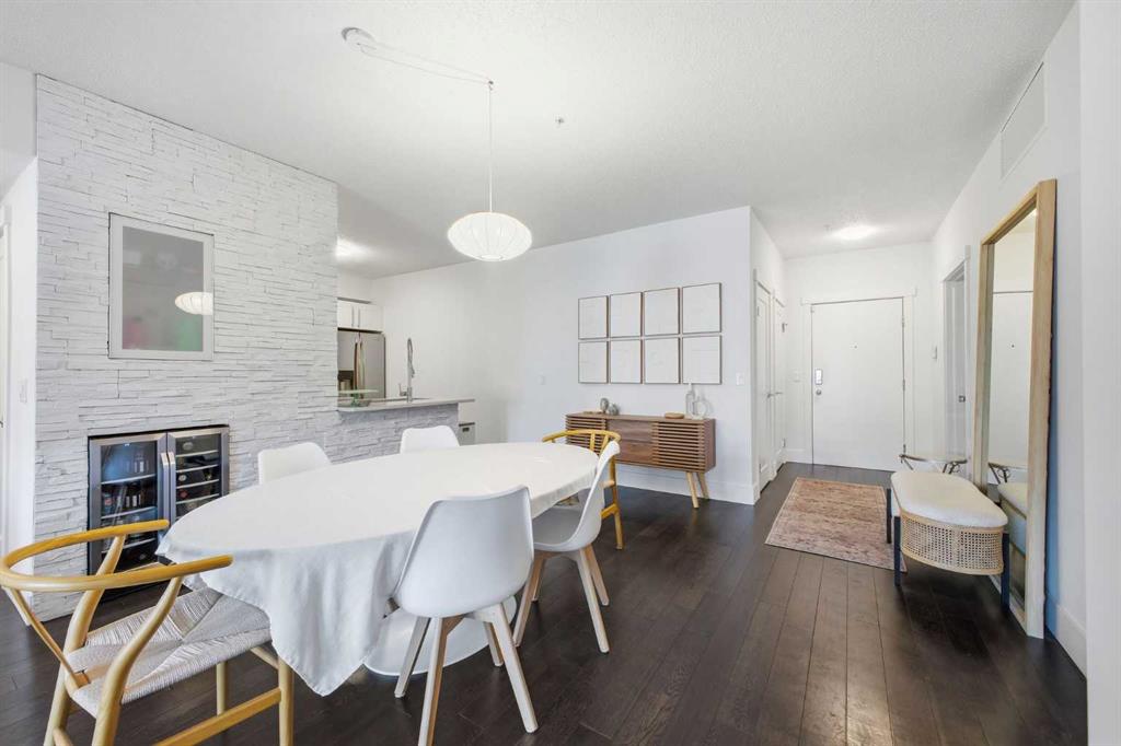 Bright and spacious, this 2-bedroom condo sits in the heart of Lower Mount Royal and offers an inviting blend of style and comfort. Espresso stained hardwood flooring and high ceilings create a warm, open feel throughout the main living spaces. The generous living area flows seamlessly into the dining space, where a feature stone wall with a built in wine fridge adds both character and function. The sleek kitchen is appointed with quartz countertops, crisp white cabinetry, and stainless steel appliances. The primary bedroom offers excellent closet space and a spa inspired 3 piece ensuite. A second bedroom and additional 4 piece bath provide ideal accommodations for guests or a dedicated home office. Additional highlights include Nest temperature control, in suite laundry, a private balcony, in suite storage, and a titled parking stall. All of this is set just steps from the vibrant shops and restaurants of 17th Avenue, close to the Bow River pathways, and within walking distance of the downtown core—an unbeatable location for urban living.