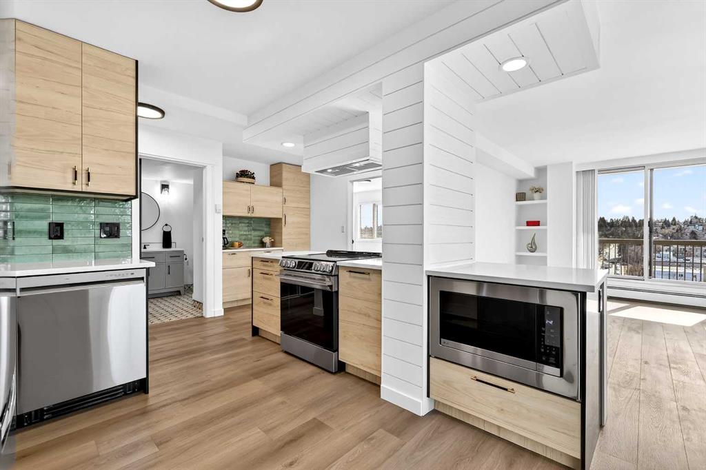FULLY REMODELED!! PENTHOUSE! NO POPCORN CEILINGS! INSUITE LAUNDRY! UNDERGROUND SECURE PARKING! Beautiful fully updated 2 bedroom and 1 bath home. Open south facing floor plan. You will fall in love with the gorgeous kitchen with quartz countertops and designer backsplash, shiplap features along with a fantastic buffet with pantry for even more wow. All new appliances with manufacturer warranties for peace of mind. The large wrap around balcony provides even more city views and lots of room to entertain. New in-suite laundry adds another level of convenience. This unit also features beautiful waterproof luxury vinyl plank flooring throughout, a large 4-piece bathroom with designer tile and a 48” vanity. Underground secure parking is included. Additional parking in the gated secure ground level can be privately rented (based on availability). Don’t miss this opportunity to call this place home! Call your favorite realtor and book a showing!