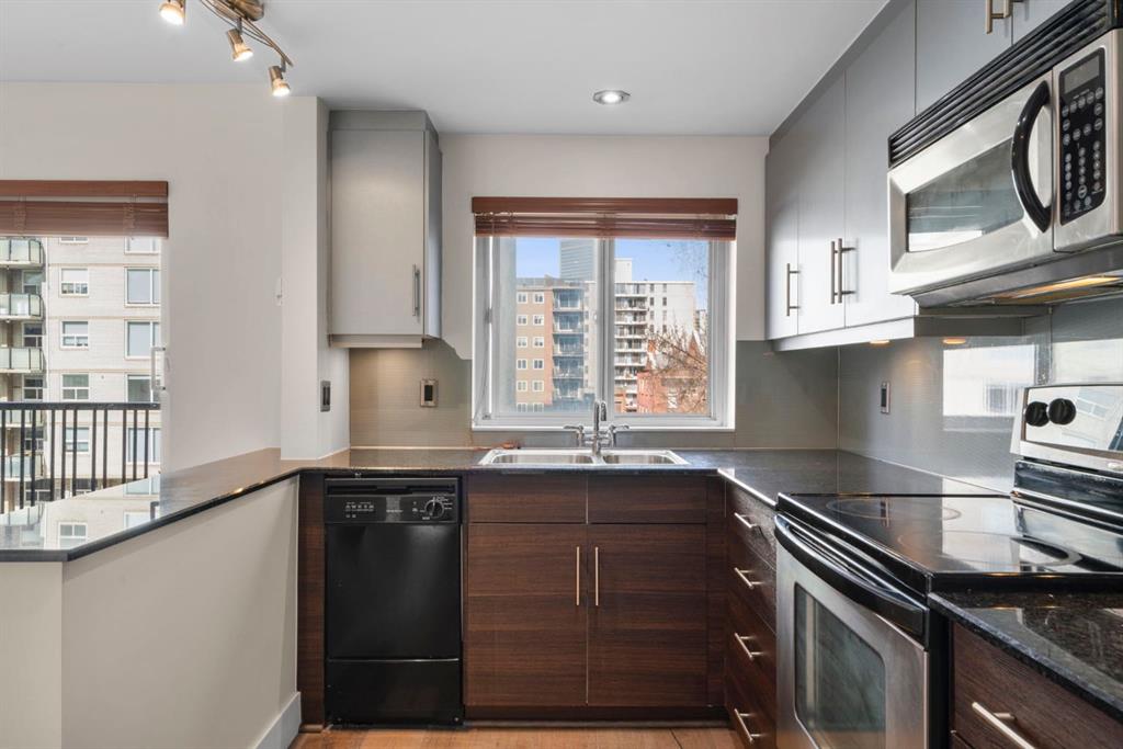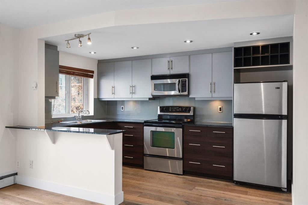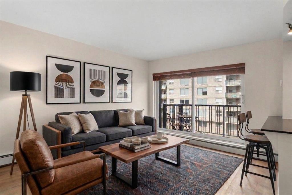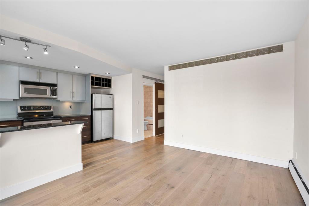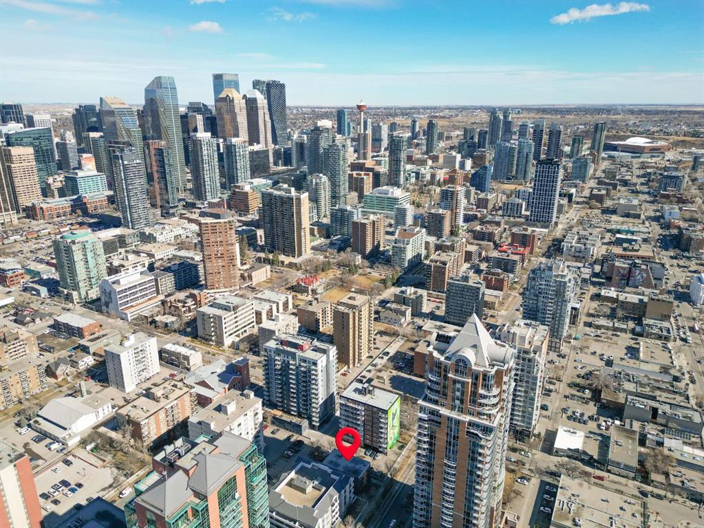TOP-FLOOR CORNER UNIT - IN ONE OF DOWNTOWN'S BEST LOCATIONS - STEPS TO 17TH AVE! Set on one of the most desirable streets in the Beltline area, this location delivers unbeatable walkability. Just steps to 17th Avenue!! You will be surrounded by Calgary’s top restaurants, cafés, fitness studios and boutiques - all within a 5-minute walk. Quiet, tree-lined and incredibly central, this building is on a street that offers both energy and calm. Located in a well-maintained small (only 16 units!) CONCRETE building, this TOP FLOOR, corner unit offers added privacy with no neighbours above you. This 4-level walk-up is known for its solid construction and quiet living. Secure FOB access gets you in the building. Inside, you’ll find NEW HARDWOOD floors throughout, BIG closet at front entrance. This unit maximizes the space - 484 sq ft - and feels big and open! Functional 1 bedroom, 1 bathroom layout with TONS of natural light. Enjoy cooking in your kitchen with lots of counter space (GRANITE!) PLUS a great sized window above the sink! Open concept. BALCONY. Nice sized bedroom with AWESOME closet space and glass sliding doors. Barn doors, baseboards, lighting, handles and cabinet coloring - truly make this unit feel updated and modern! LAUNDRY IN THE UNIT! Brand new washer/dryer. Soaker tub. PET-FRIENDLY building (with board approval) - no size or breed restrictions - makes this a rare find for pet owners in the inner city!!! Condo fees include heat and water. An ideal opportunity for those seeking inner-city living with exceptional walkability, privacy and long-term value. Don't have a car? You can literally WALK/BIKE everywhere....But this unit comes with assigned parking! Work downtown? Enjoy the benefits of inner-city living - with reduced commute times = come home for lunch or take the dog out! Transit is close - 2 bus stops within a two min walk. Perfect for young professionals, first-time buyers or investors! STOP renting - pay your own mortgage instead!!!! NO POST TENSION CABLES! SHORT TERM RENTALS ALLOWED WITH BOARD APPROVAL!