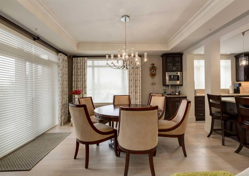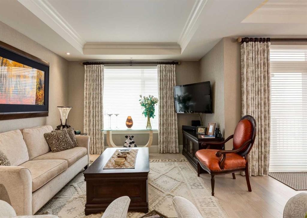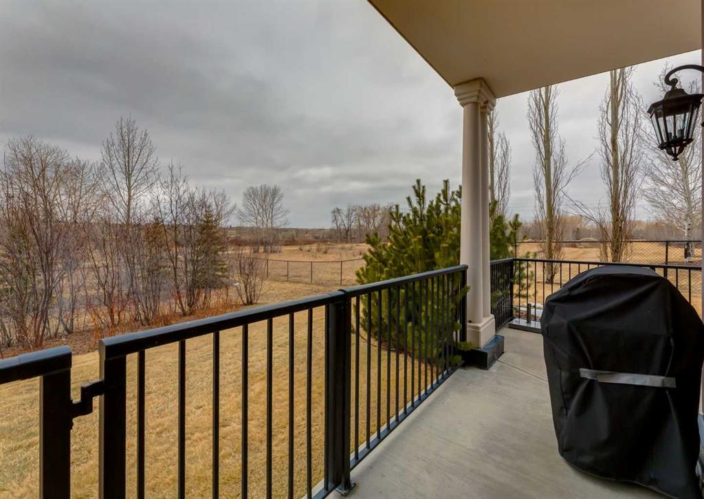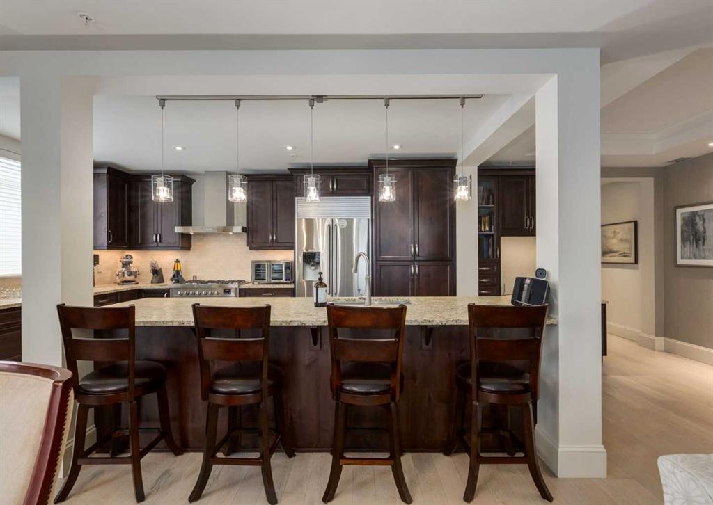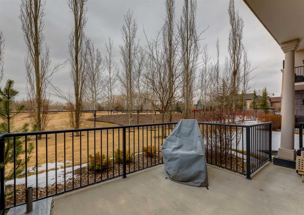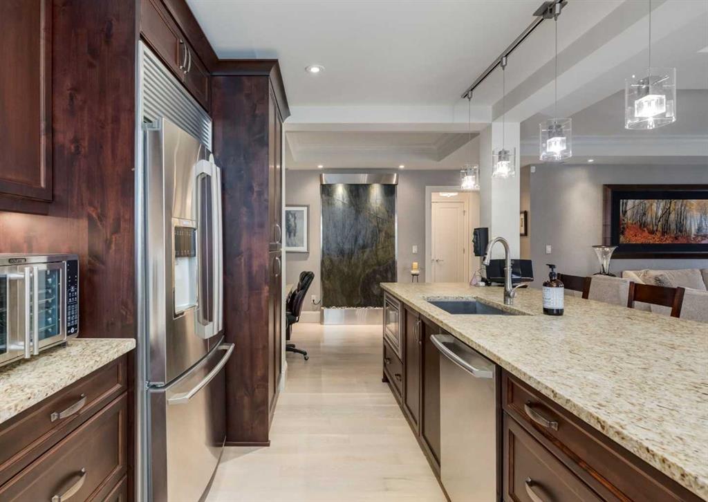Coveted, Spectacular Corner Unit location on the main floor offering a harmonious blend of luxurious decor and natural beauty right outside your door. Unobstructed views of the Bow River and parkland, with lots of opportunity to ride your bike, walk and enjoy the outdoors and wildlife that wander close by for your enjoyment. Kitchen with plumbed-in coffee maker, gas stove, dishwasher, fridge, hood fan, microwave. Espresso color cabinetry and leathered granite countertops. Beautiful island overlooking dining and living rooms with an amazing view of the extensive yard & beyond the walking paths to the river. Breakfast bar seating for 4 with stools included. Lovely built-in desk with ample shelving. Engineered flooring (Arctic Oak). Water Feature! Custom draperies. All window blinds are motorized throughout. Bedrooms have black out drapes. (Custom window coverings) Primary bedroom with 5-piece bath and heated towel bar is very spacious with 2 sinks, tub/separate shower. Walk-in closet with ample, well designed shelving. 3-piece bathroom is shared with second bedroom for complete privacy or easy for visitors as well. Lots of built-in storage. Stacking washer/dryer. Gas outlet on patio. 2 Titled Parking Stalls/P2 included. 1 Titled Storage included. (A 3rd Parking Stall may be purchased from the seller but is Not Included). Bicycle storage included. Car wash. Pet friendly with board approval. Walk to Carburn Park. Easy access to major transportation routes, shopping, restaurants, YMCA and a lot more! Champagne is a wonderful, amazing condo complex. You are going to love it!!