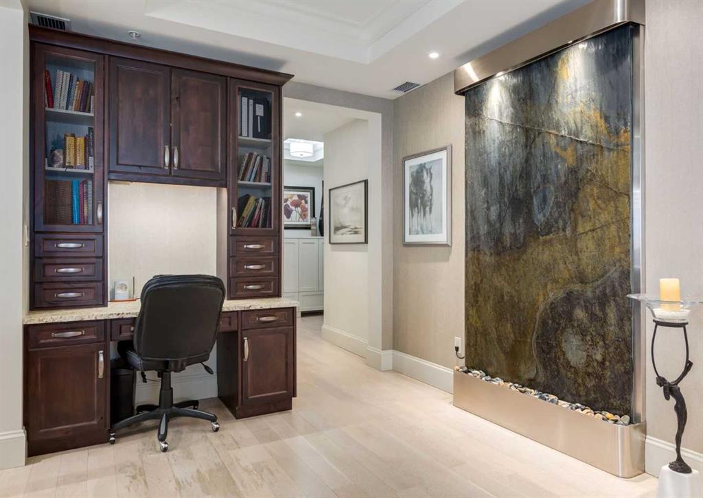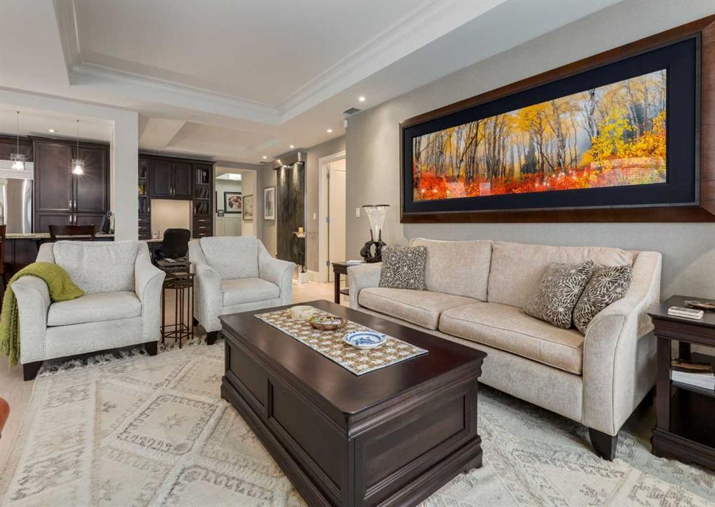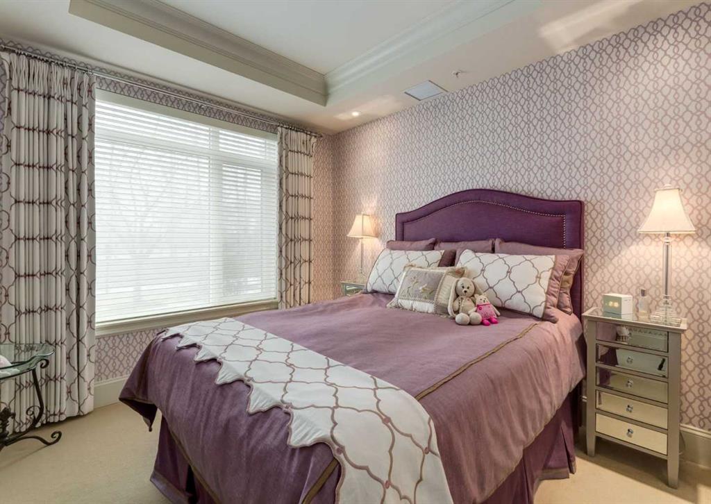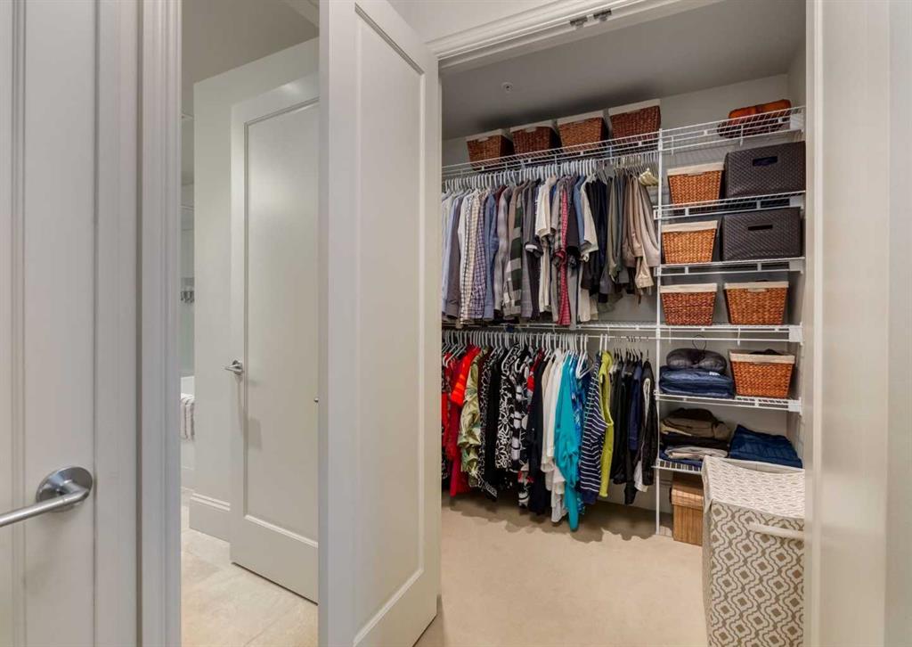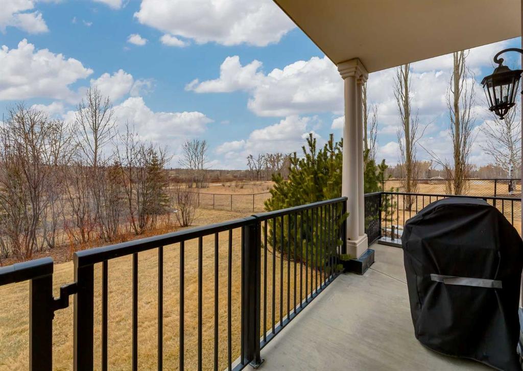Coveted, Spectacular Corner Unit location on the main floor offering a harmonious blend of luxurious decor and natural beauty right outside your door. Unobstructed views of the Bow River and parkland, with lots of opportunity to ride your bike, walk and enjoy the outdoors and wildlife that wander close by for your enjoyment. Kitchen with plumbed-in coffee maker, gas stove, dishwasher, fridge, hood fan, microwave. Espresso color cabinetry and leathered granite countertops. Beautiful island overlooking dining and living rooms with an amazing view of the extensive yard & beyond the walking paths to the river. Breakfast bar seating for 4 with stools included. Lovely built-in desk with ample shelving. Engineered flooring (Arctic Oak). Water Feature! Custom draperies. All window blinds are motorized throughout. Bedrooms have black out drapes. (Custom window coverings) Primary bedroom with 5-piece bath and heated towel bar is very spacious with 2 sinks, tub/separate shower. Walk-in closet with ample, well designed shelving. 3-piece bathroom is shared with second bedroom for complete privacy or easy for visitors as well. Lots of built-in storage. Stacking washer/dryer. Gas outlet on patio. 2 Titled Parking Stalls/P2 included. 1 Titled Storage included. (A 3rd Parking Stall may be purchased from the seller but is Not Included). Bicycle storage included. Car wash. Pet friendly with board approval. Walk to Carburn Park. Easy access to major transportation routes, shopping, restaurants, YMCA and a lot more! Champagne is a wonderful, amazing condo complex. You are going to love it!!