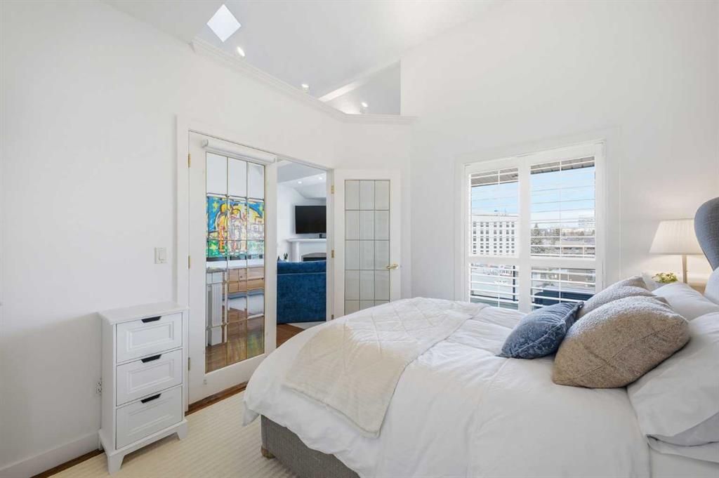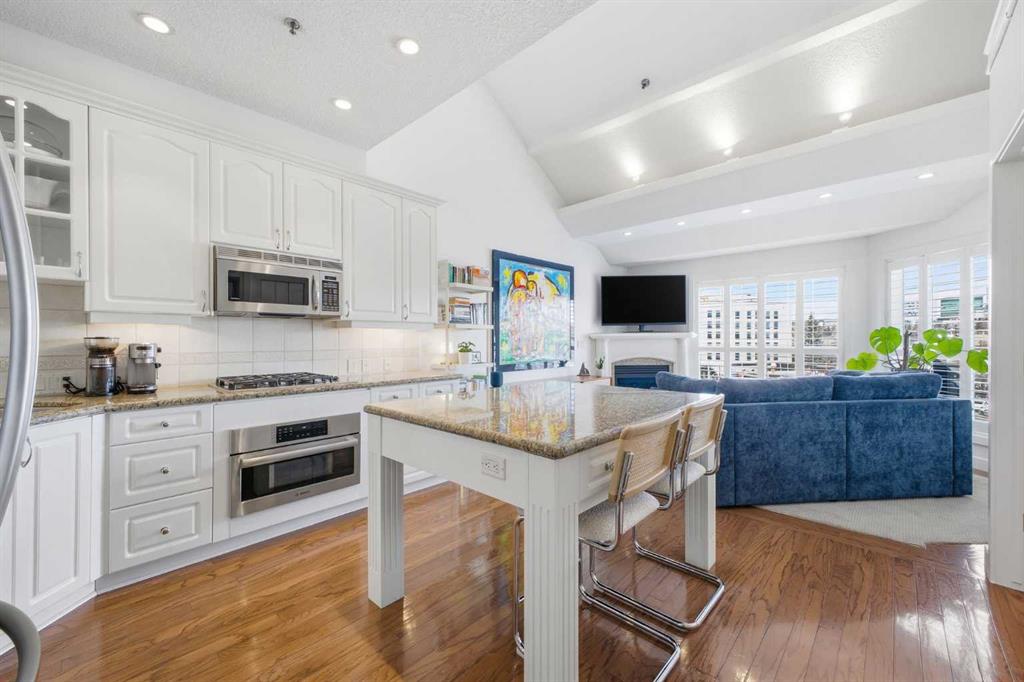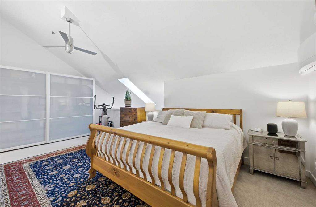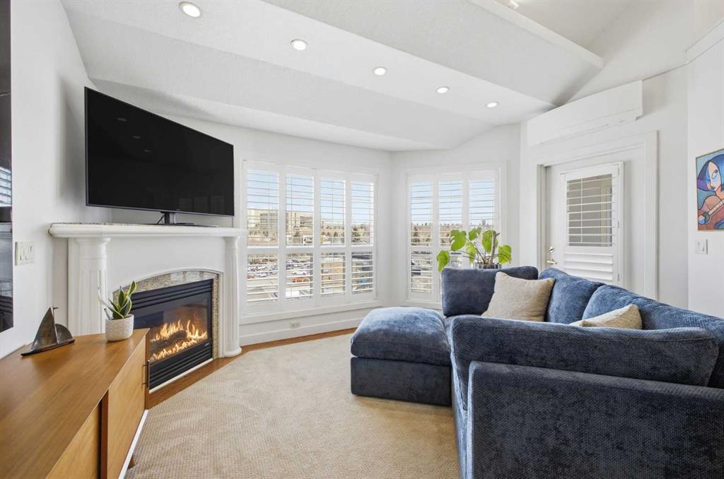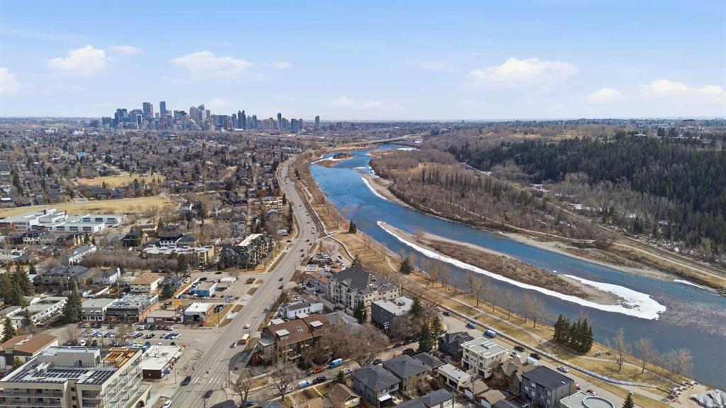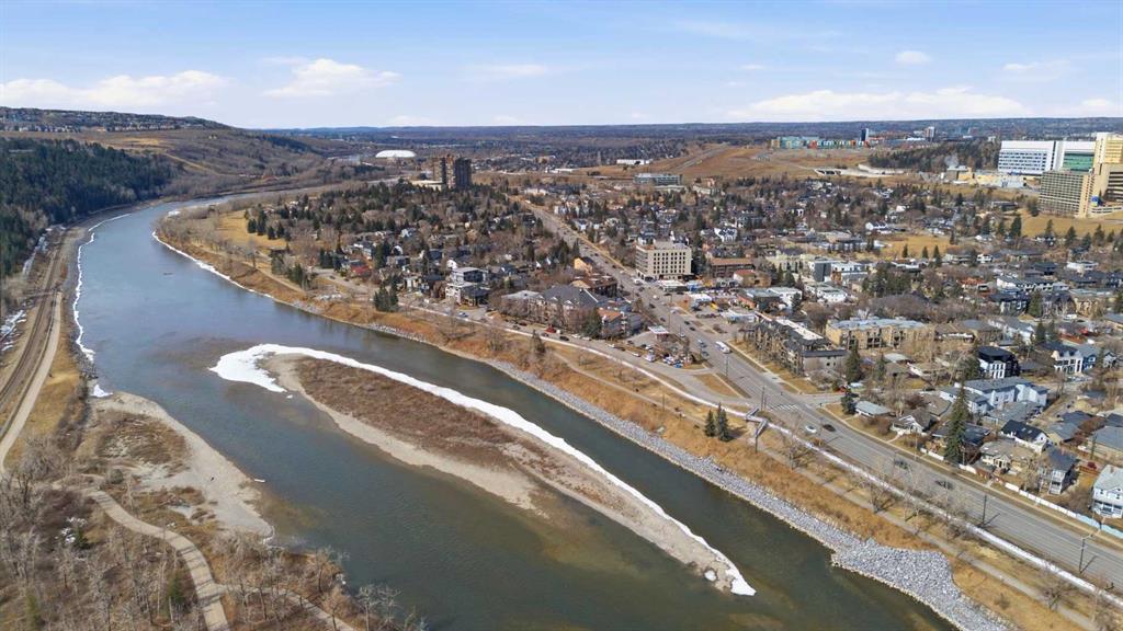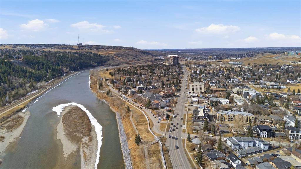 This rare two-storey, 3-bedroom, 3-full-bathroom, 2-parking stall top floor condo sits just steps from the scenic Bow River pathway system and offers exceptional space, soaring vaulted ceilings with skylight, and nearly $45,000 in recent upgrades—all within an exceptionally quiet, boutique 28 unit building. The bright, open main level features a generous living area with a refreshed feature fireplace and access to a large balcony with expansive views of mixed green space and the city. From this fourth floor vantage point, enjoy sightlines to the Bow River Valley escarpment to the west, St. Andrew’s Heights, the Parkdale Hillside Trailhead, and the Foothills Hospital complex, which creates a warm, glittering backdrop after sunset. The well appointed kitchen offers granite countertops, abundant storage, and a full suite of upgraded appliances including a brand new Bosch oven, Bosch gas cooktop, Bosch dishwasher, and a new LG ThinQ refrigerator with water and ice dispenser. Two bedrooms—both with French doors—and two full bathrooms are located on the main level. The primary bedroom features ample closet space and a private 4 piece ensuite with a relaxing jetted tub and separate shower. The upper level hosts a private, versatile loft space enhanced by vaulted ceilings and a skylight that fills the area with natural light. This flexible room can serve as a third bedroom, home office, or quiet retreat. A third full bathroom with laundry facilities completes the upper level. Major recent upgrades include a high efficiency, whisper quiet Daikin 3 head ductless air conditioning/heat pump system (5 year warranty) providing independent heating and cooling in every room; a 75 gallon Bradford White True Combi Tank hot water system (6 year warranty); new hot water tank valves and piping; a custom California Closets front entry closet system; custom Hunter Douglas roller shades on the French doors of all main level bedrooms; and a full fireplace overhaul and cleaning. Additional features include fresh paint throughout, in floor heating, and refreshed bathrooms with new ceiling fans and hardware. Two titled underground heated parking stalls—a significant advantage in this location—plus a convenient storage unit directly in front of one stall complete this outstanding offering. Directly across from the Bow River, the building provides immediate access to the river pathway system, Edworthy Park, the Douglas Fir Trail, and countless outdoor amenities, while still being minutes to schools, shopping, transit, the University of Calgary, Foothills and Children’s Hospitals, and major routes.