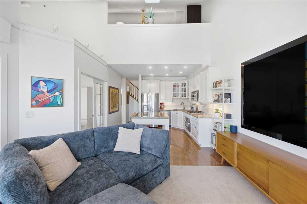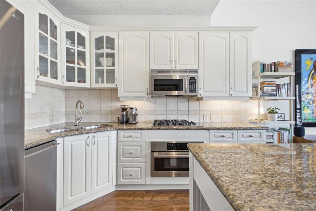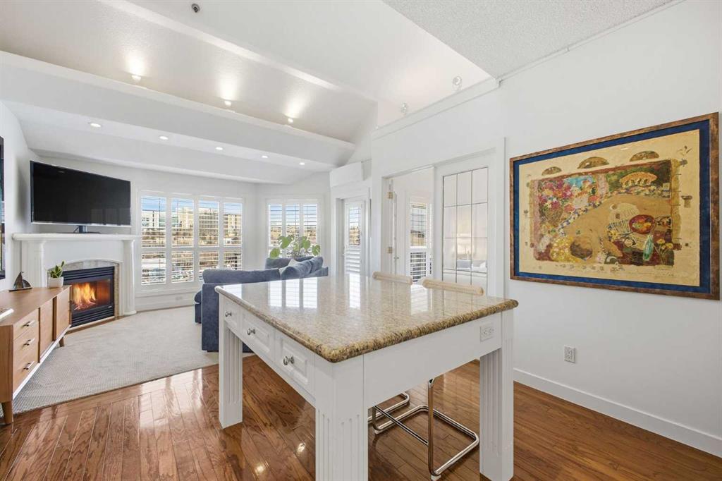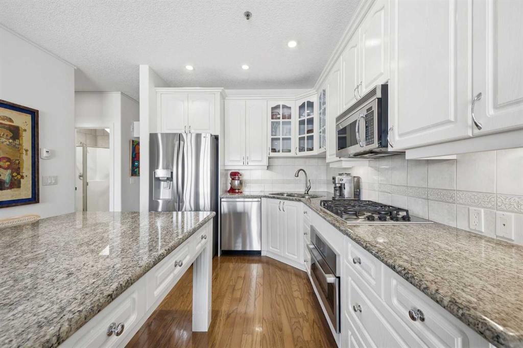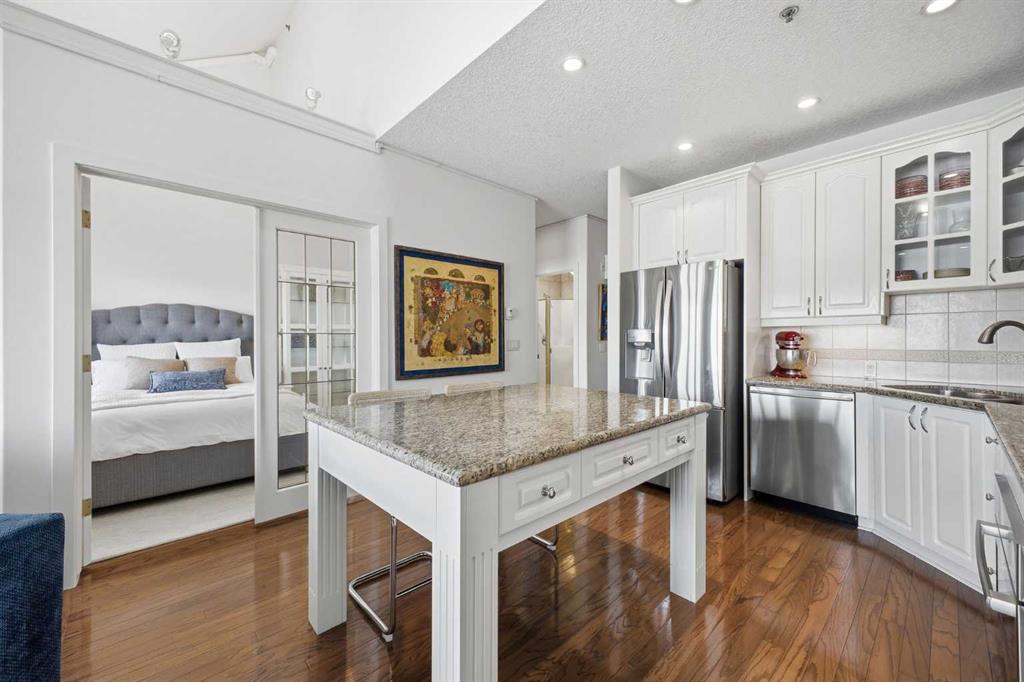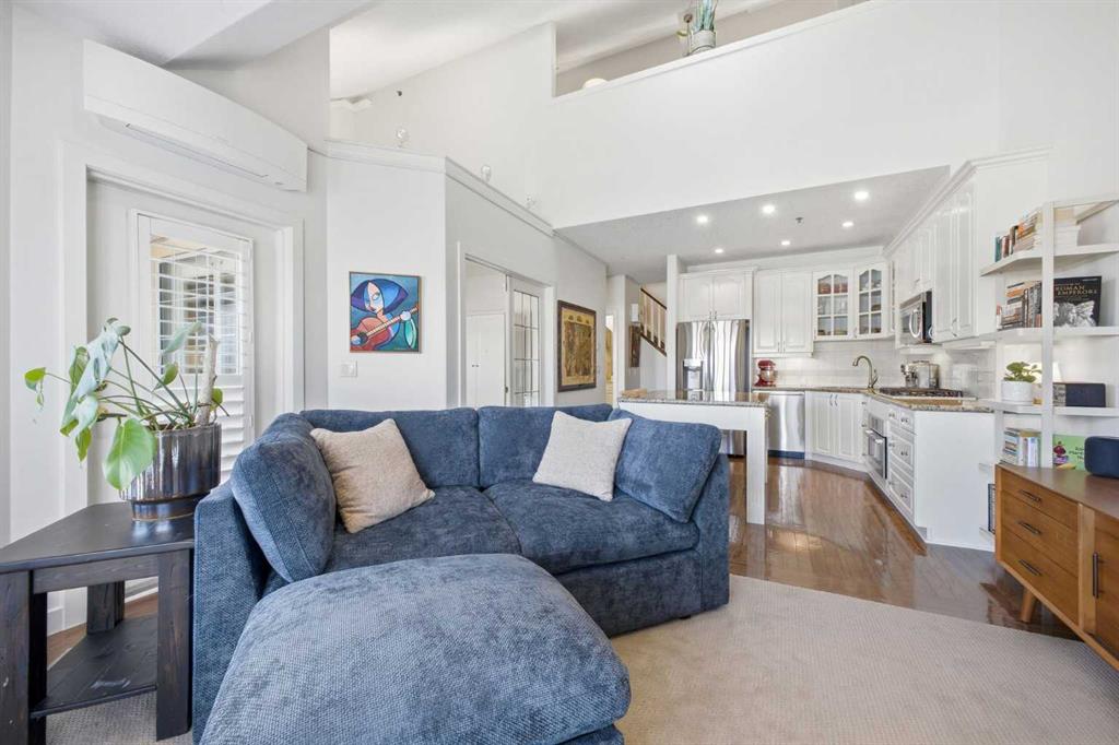 This rare two-storey, 3-bedroom, 3-full-bathroom, 2-parking stall top floor condo sits just steps from the scenic Bow River pathway system and offers exceptional space, soaring vaulted ceilings with skylight, and nearly $45,000 in recent upgrades—all within an exceptionally quiet, boutique 28 unit building. The bright, open main level features a generous living area with a refreshed feature fireplace and access to a large balcony with expansive views of mixed green space and the city. From this fourth floor vantage point, enjoy sightlines to the Bow River Valley escarpment to the west, St. Andrew’s Heights, the Parkdale Hillside Trailhead, and the Foothills Hospital complex, which creates a warm, glittering backdrop after sunset. The well appointed kitchen offers granite countertops, abundant storage, and a full suite of upgraded appliances including a brand new Bosch oven, Bosch gas cooktop, Bosch dishwasher, and a new LG ThinQ refrigerator with water and ice dispenser. Two bedrooms—both with French doors—and two full bathrooms are located on the main level. The primary bedroom features ample closet space and a private 4 piece ensuite with a relaxing jetted tub and separate shower. The upper level hosts a private, versatile loft space enhanced by vaulted ceilings and a skylight that fills the area with natural light. This flexible room can serve as a third bedroom, home office, or quiet retreat. A third full bathroom with laundry facilities completes the upper level. Major recent upgrades include a high efficiency, whisper quiet Daikin 3 head ductless air conditioning/heat pump system (5 year warranty) providing independent heating and cooling in every room; a 75 gallon Bradford White True Combi Tank hot water system (6 year warranty); new hot water tank valves and piping; a custom California Closets front entry closet system; custom Hunter Douglas roller shades on the French doors of all main level bedrooms; and a full fireplace overhaul and cleaning. Additional features include fresh paint throughout, in floor heating, and refreshed bathrooms with new ceiling fans and hardware. Two titled underground heated parking stalls—a significant advantage in this location—plus a convenient storage unit directly in front of one stall complete this outstanding offering. Directly across from the Bow River, the building provides immediate access to the river pathway system, Edworthy Park, the Douglas Fir Trail, and countless outdoor amenities, while still being minutes to schools, shopping, transit, the University of Calgary, Foothills and Children’s Hospitals, and major routes.