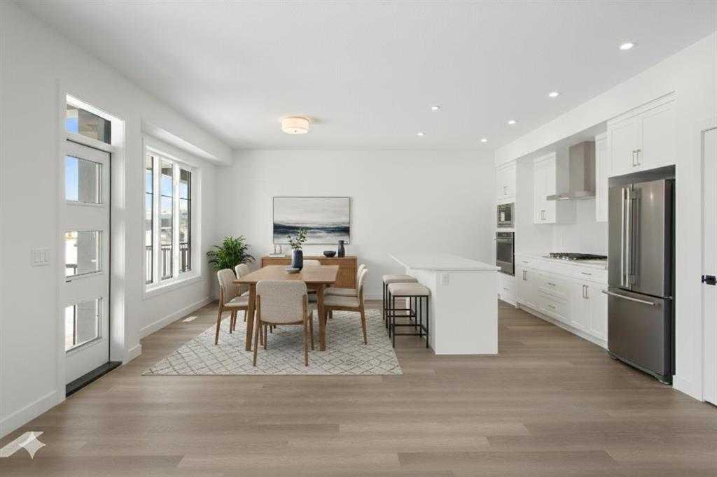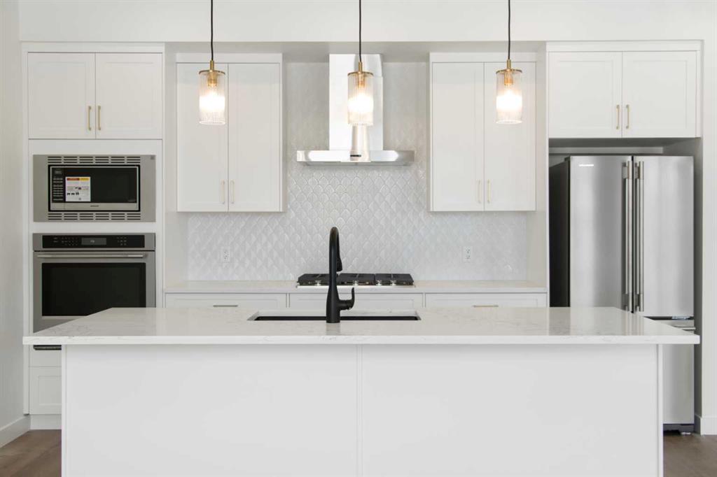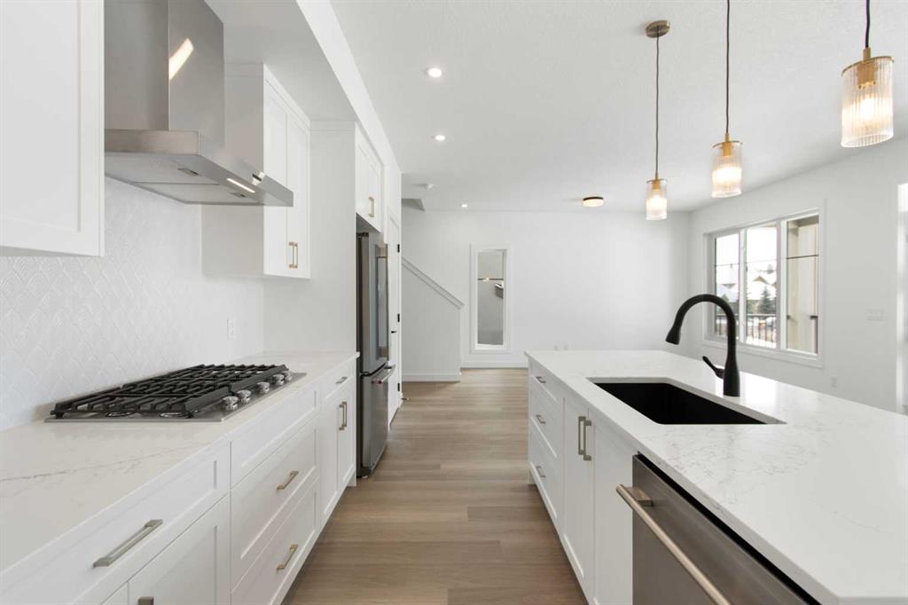 Brand new and situated in the prestigious community of Aspen, this fully finished single-family home offers over 2350 sq ft of developed living space! With 4 bedrooms and 3.5 bathrooms. You won't find a better-priced detached home in the area! The open-concept main floor features a chef-inspired kitchen equipped with a gas cooktop, built-in wall oven and microwave, and elegant gold pendant lighting over a large quartz island. Large windows flood the living and dining areas with natural light, highlighting the durable LVP flooring that extends throughout the entire home, including the upper floor and the fully finished basement. Upstairs l is thoughtfully designed with three bedrooms PLUS a dedicated home office/tech room. The primary suite provides a spacious retreat, featuring an ensuite with a luxury stand-alone tub and a full glass shower with dual vanities and full tile! Convenience is built-in with a large upper-floor laundry room finished with quartz countertops. The fully finished lower level adds a versatile fourth bedroom, a full bath, and a secondary media room or lounge! Tons of space for the whole family. Practical additions include an AC rough-in, a double attached insulated garage, and a full new home warranty. This property represents exceptional value, featuring over $20,000 in premium builder upgrades over and above the high standard specification.