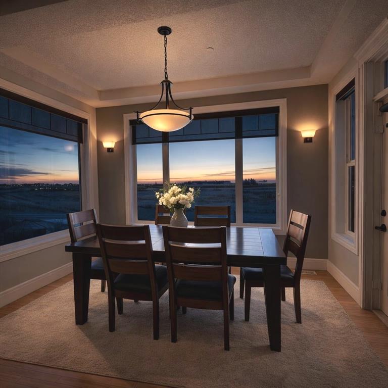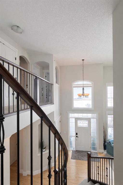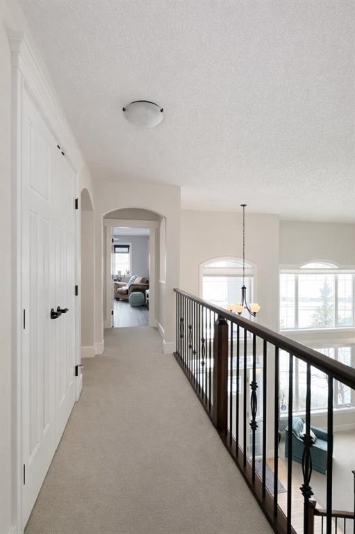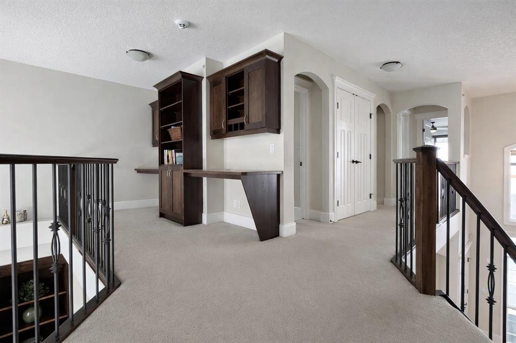 Welcome to prestigious Lakes of Muirfield—an exceptional luxury family home offering over 4,200 sq ft of developed living space, perfectly positioned backing onto the canal and golf course with greenspace to both the side and rear, creating a rare private setting with no neighbours behind. This stunning residence showcases 4 bedrooms and 4 bathrooms, impressive curb appeal, and a grand interior featuring hardwood flooring and a striking curved staircase. The main level boasts a vaulted family room with oversized windows, a formal dining room, and an elegant open-to-above living room flooded with natural light. The spacious kitchen is designed for both function and style with rich cappuccino cabinetry, a corner pantry, a large sit-up island with prep sink, an additional main sink overlooking the views, and a bright dining nook with tray ceiling and direct access to the large deck with gas line for BBQ—perfect for entertaining. A private office/den with sleek sliding pocket doors and a powder room complete this level. Upstairs, a grand double-door entry leads to the luxurious primary retreat featuring a spa-inspired ensuite with oversized shower, standalone soaker tub, dual vanities, and a generous walk-in closet, while two additional bedrooms—both with walk-in closets—along with a full bathroom and convenient upper laundry complete the upper floor, all enhanced by open-to-below design elements that elevate the home’s sense of space and elegance. The fully developed basement offers vinyl plank flooring throughout, a large recreation/entertainment space, gym area, fourth bedroom, and full bathroom, with direct access to a covered patio and beautifully landscaped yard featuring a pergola and shed, all set against serene canal and golf course views. Ideally located just minutes to Strathmore, Langdon, and Chestermere, with an easy 20-minute commute to Calgary and close proximity to the new De Havilland plant—this is luxury living in a peaceful, scenic setting.